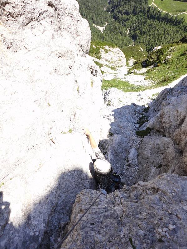 Vom Gipfel seilt man zum vorletzten Standplatz der „Südkante“ ab (siehe Topo bzw. Übersichtsfoto). Von diesem seilt man weiter ab in die westlich gelegene Schlucht (60m!) Hier findet man dann einen Steinmann bzw. alte Markierungen. Über gestuftes Gelände zum ersten Standplatz abklettern und dann weiter zum Einstieg. Anstelle des Abkletterns kann man auch eine „Köpflschlinge“ zurücklassen und abseilen (siehe Übersichtsfoto).