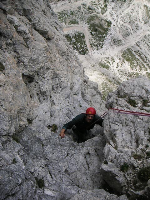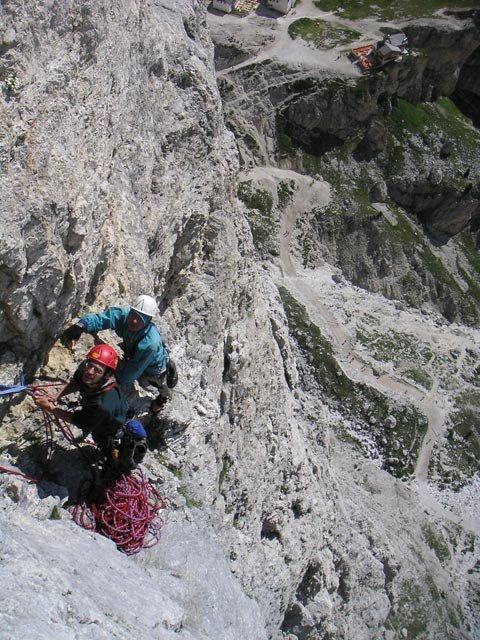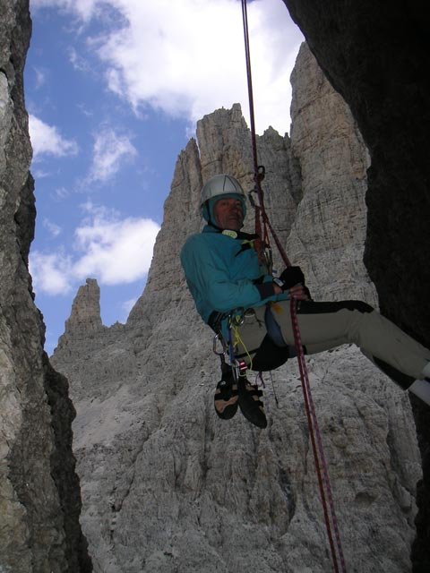 Vom Gipfel 40m waagrecht nach Westen (Richtung Rosengartenspitze) bis kurz vor den Abbruch. Hier nach rechts (N) absteigen (Steigspuren, Steinmänner), nach links um einen Kantenabsatz herum (W), 8m an Köpfl abseilen oder abklettern (3) auf ein Band zu Abseilring.1x25m abseilen in die klammartige Scharte. Die Schlucht nach rechts abwärts (NW), bei Abbruch links heraus auf Felsband und hinunter zum markierten Weg Vajolethütte - Gartl.