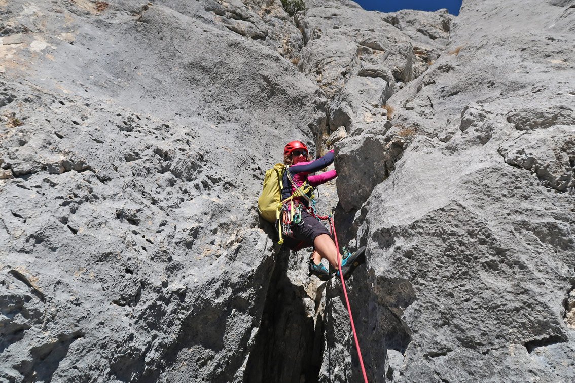 Kletterausrüstung, 60 m Einfachseil, 8 Expressschlingen, Helm und ein paar Bandschlingen.