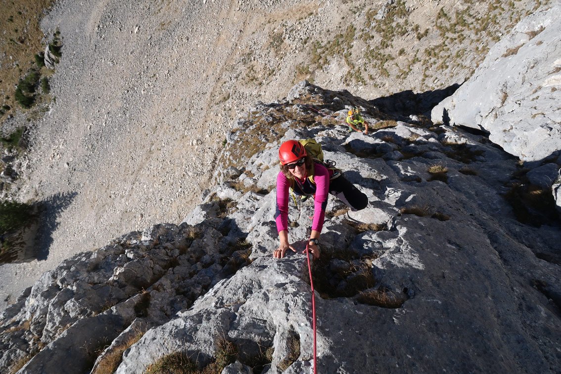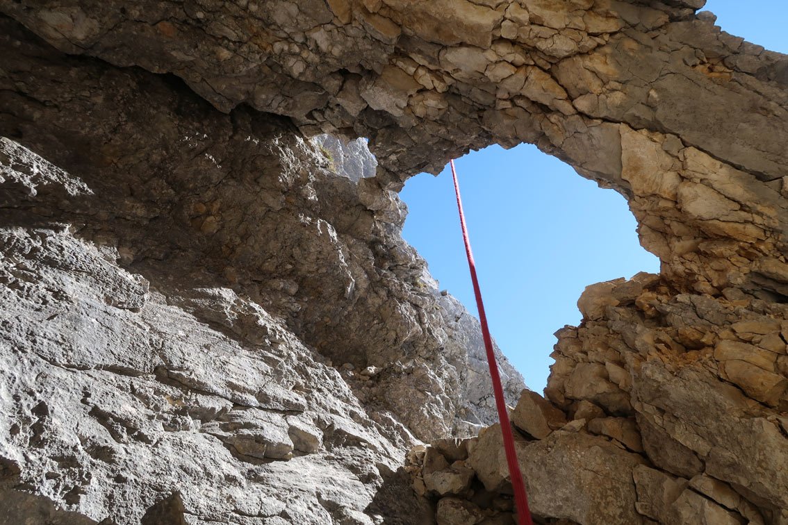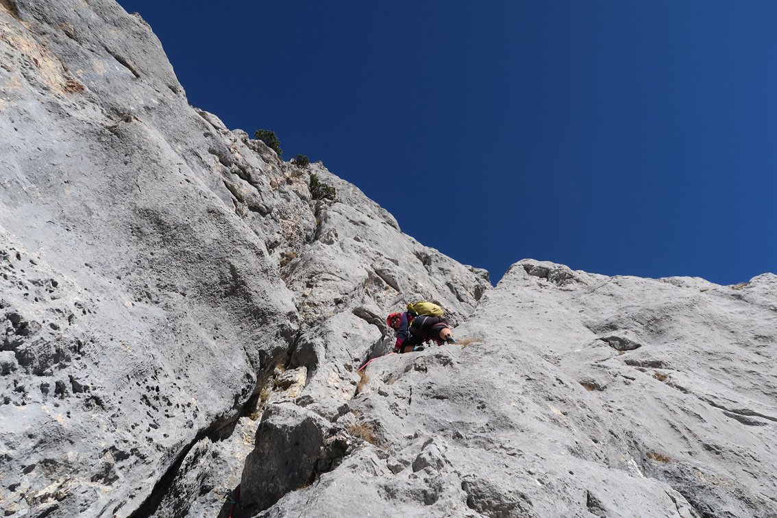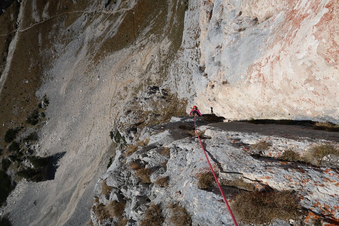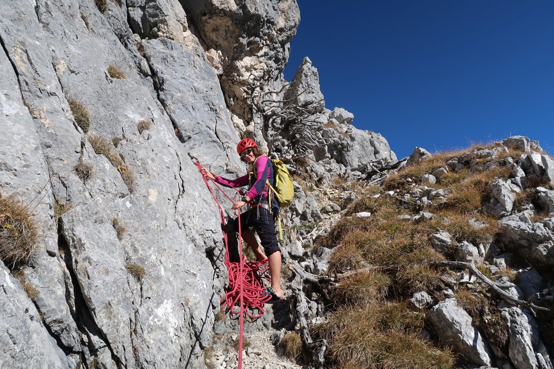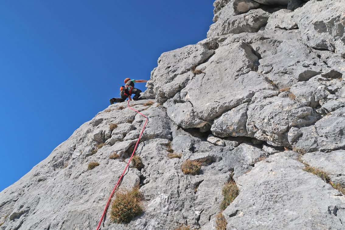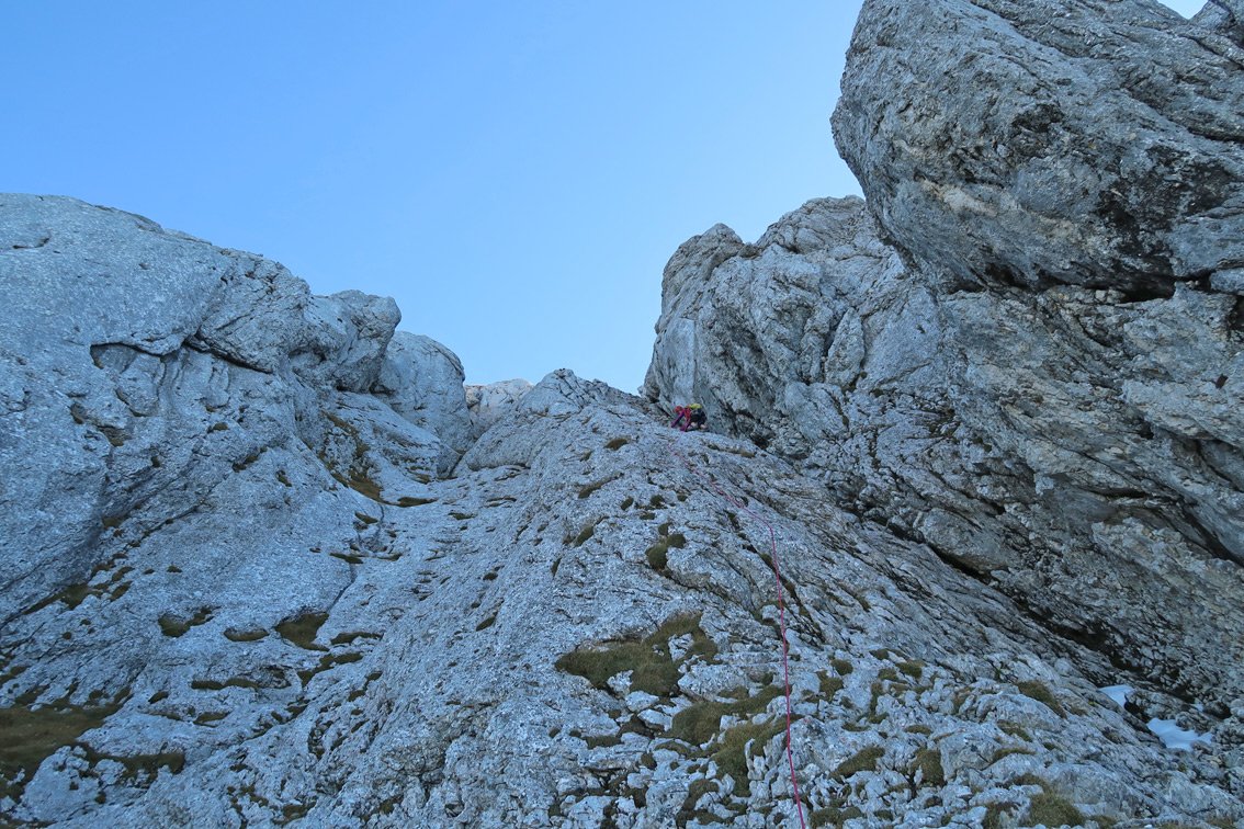 Die Südverschneidung ist gut abgesichert - einzig in den leichten Seillängen steckt wenig. Der 3te Grad sollte also sicher geklettert werden.