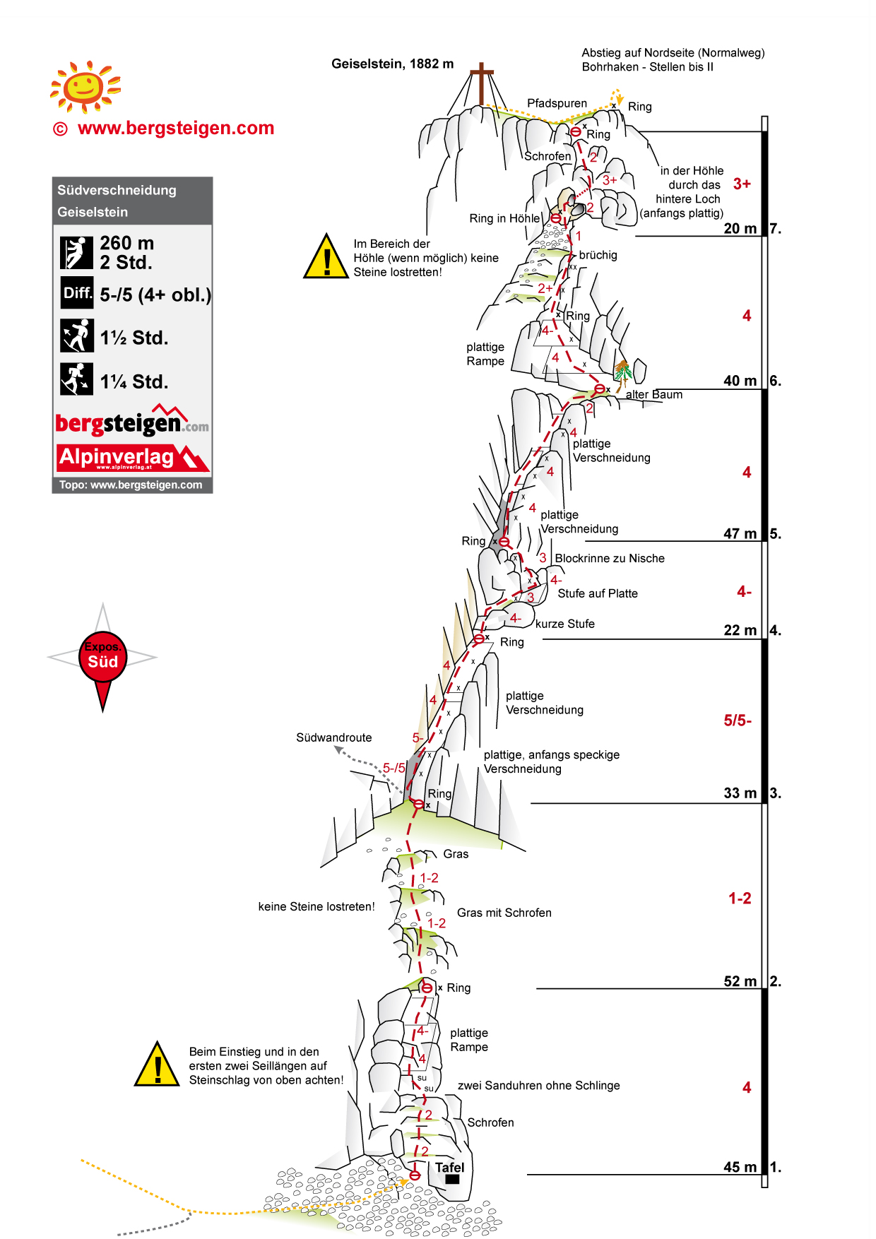 Steinschlag: Beim Einstieg sollte man aufpassen, ob Seilschaften oberhalb in der Wand sind. Im Bereich der Höhle sollte man keine Steine lostreten. Shuttlebus Kenzenhütte: www.berggasthof-kenzenhuette.de Tipp: Die Straße ist ideal mit dem MTB zu befahren, die Straße ist asphaltiert (nur wenige flache Passagen Schotter). Am Beginn der Wiesenfläche Ebenwald/Wankerfleck zweigt rechts ein Forstweg zu einem kleinen Staubecken ab. Mit dem Fahrrad über die Staumauer, auf der anderen Seite muss man es ein paar Stufen hinauf tragen, dann auf der Westseite des Sees auf einem Forstweg in Richtung Süden, neuerlich südlich auf den unscheinbaren Forstweg abzweigen und der Beschilderung Geiselsteinjoch folgen. Dort wo der unscheinbare Forstweg endet, befindet sich das Bikedepot.