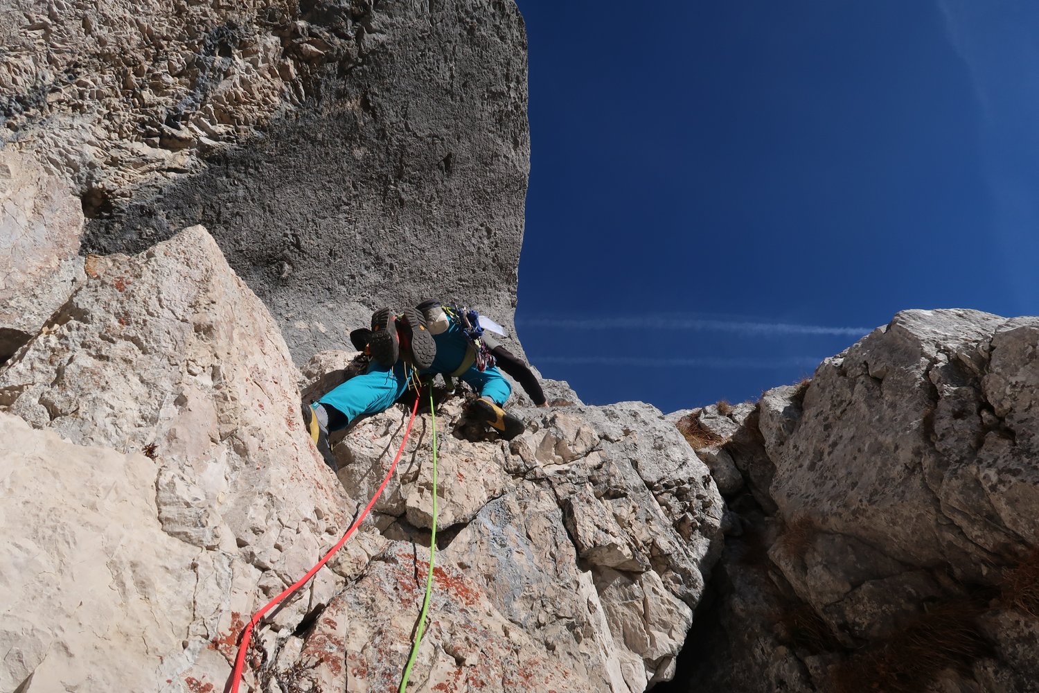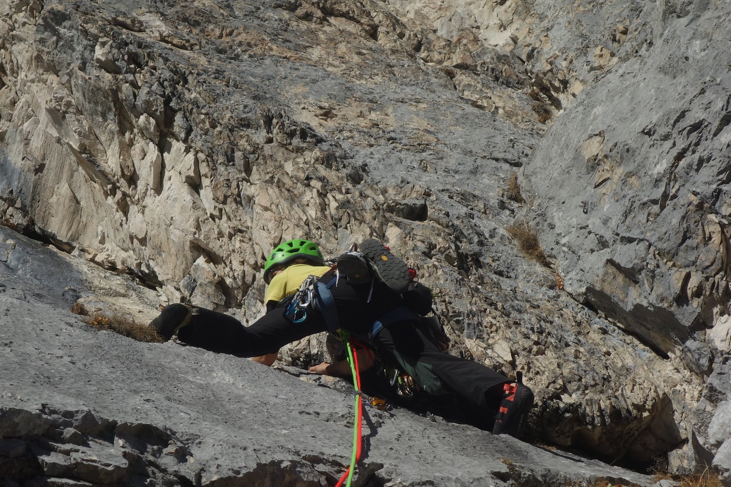 Die Südverschneidung Südwand ist gut mit Bohrhaken, Normalhaken und ein paar Schlingen abgesichert. Mit ein paar mittleren Friends/Cams noch weiter optimierbar.
