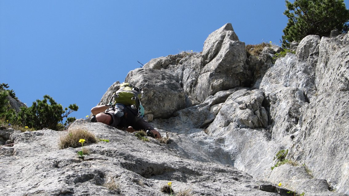 Die Route ist bis auf wenige Meter (in der 4. Seillänge ) identisch mit der Südverschneidung aus dem Jahre 1935 - alte Haken zeugen von der Vergangenheit.