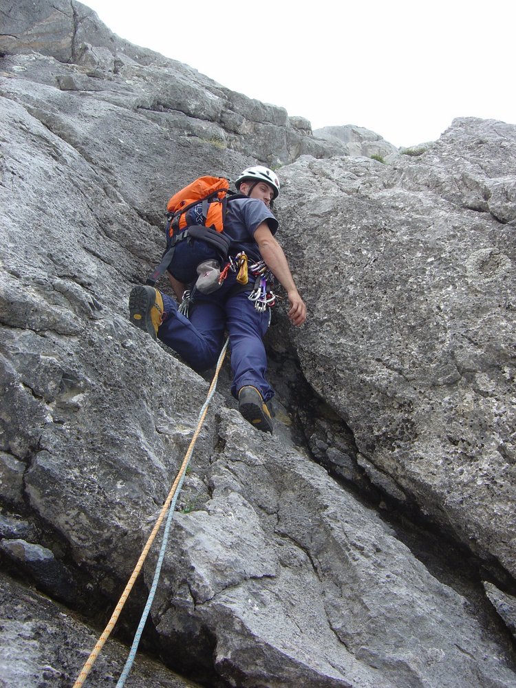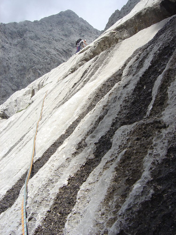 Nun in einem Bogen (2) von links nach rechts zu einem Steilaufbau. In einer Verschneidung und dem folgenden Riß empor, Querung nach rechts zu Haken und über die steile Wand (3+) zu Stand. Rechts setzt eine Platte mit tiefer Wasserrille an (4), die bis zum Ende verfolgt wird. Über die Rampe (2+) rechtshaltend weiter zu Stand. Kurz nach rechts zur Ausstiegsrinne (2-) und in leichtes Gelände.´