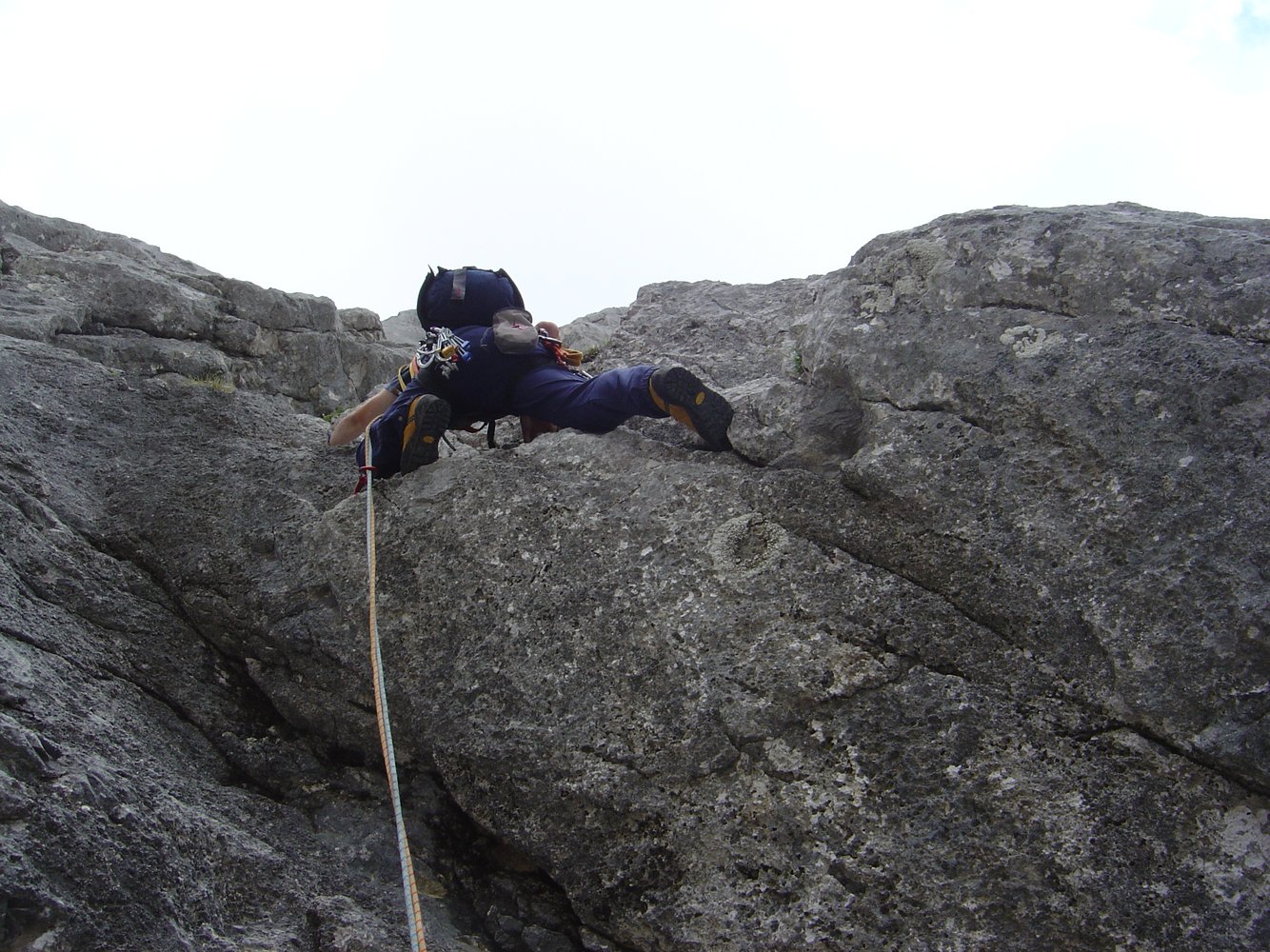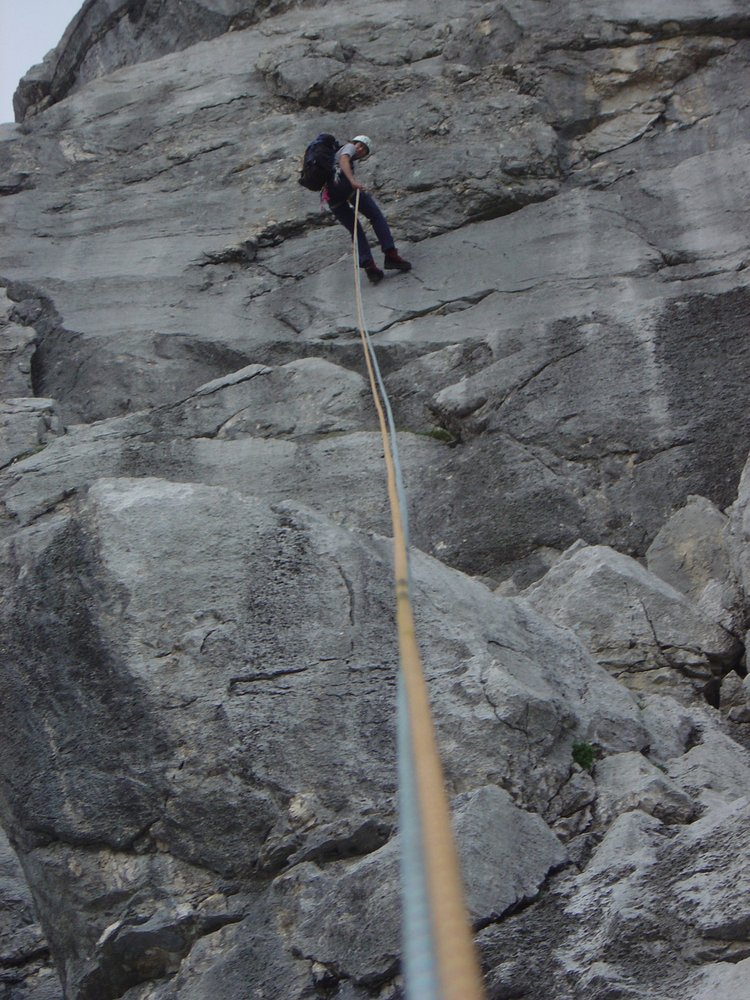 Danach 2x 30m (im ersten Teil überhängend) und 1x 40m abseilen. Mit einem 50m Halbseil kann auch auf zwei Mal bis zum Wandfuß abgeseilt werden (Abseilstand nach ca. 40m um ein paar Meter rechts versetzt in dunkler Plattenzone).