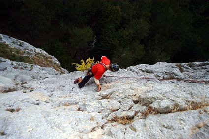 Entweder abseilen (3 x 35 m ) oder über Wildenauer (Klettersteig D) zurück zum Einstieg. Beim Abseilen bei der ersten Abseilstelle Expressschlingen einhängen (überhängend)!
