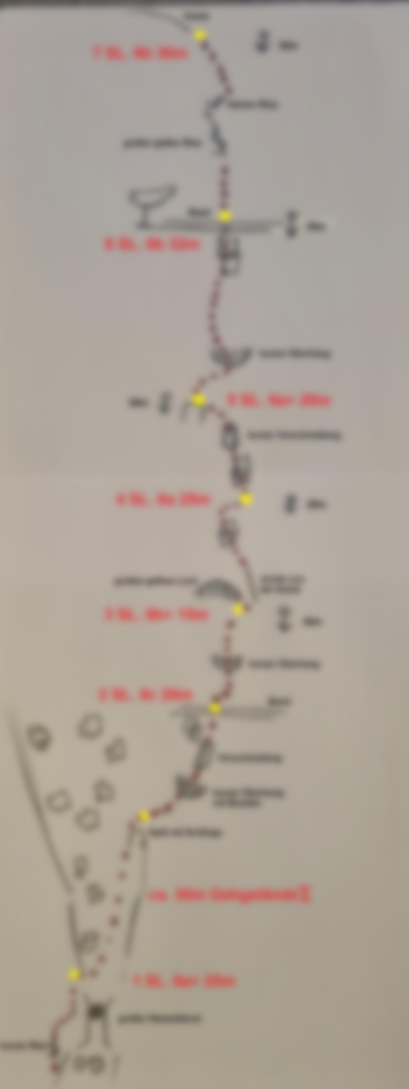 Absicherung: gebohrte Stand- und Zwischenhaken, Klassifikation S2 – S2 = Größerer Hakenabstand mit zwingenden Kletterpassagen. Potenzielle Sturzlänge beträgt höchstens 10 Meter und Sturz hat keine Verletzungen zur Folge).