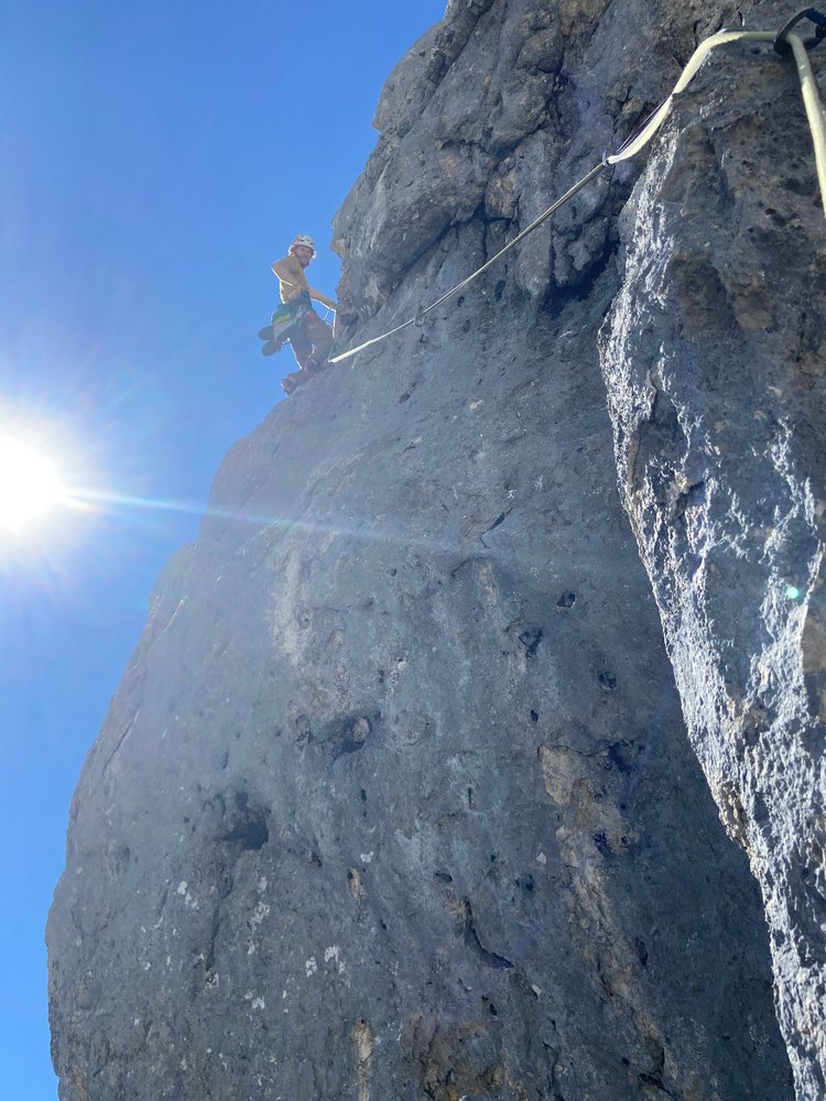 Bitte über den neuen Abstieg absteigen. Wegen Steinschlag Gefahr beim Seil abziehen! Der Abstieg ist Rot markiert. Es sind alle Abseilstände eingerichtet. Man sieht den Weg gut vom letzten Stand aus. Wenn man leicht rechts Richtung Sonneck schaut, dann sieht man die Roten Punkte! Siehe Topo!