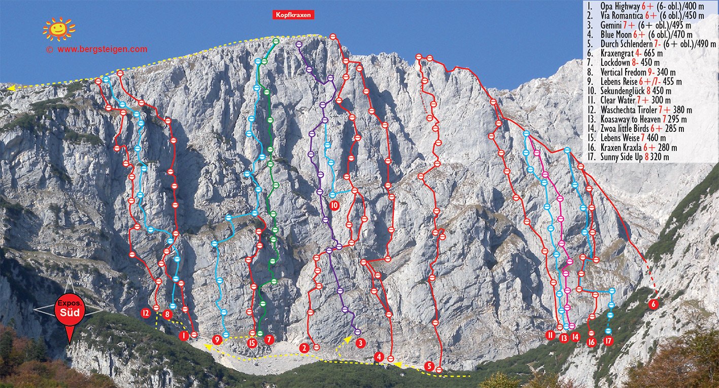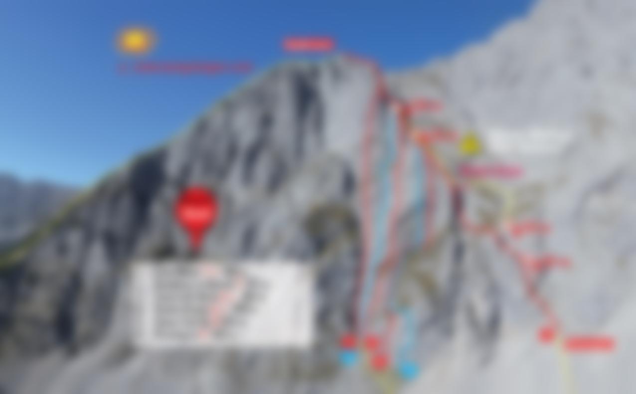A: Für Variante A ist ein eingerichteter Weg mit Abseiler (Rot markiert)! Beim letzen Stand muss man in eine Scharte auf der Hinterseite Abseilen (25m Meter). Weiter zu einer Fix Kette. Die Kette folgen und dann das Band weiter Richtung Sonneck Südwand gehen. (Rote Punkte). Da dann ein Bachbett/ Schotterrinne nach unten zum Abseilstand folgen ( Rot Punkte). Da dann in die Scharte abseilen 2x 50 m. Der Ausgangspunkt ist dann der Einstieg vom Kraxengrat!