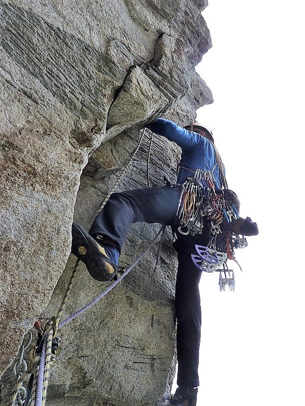 Kletterausrüstung, Helm, 11 Expressschlingen, 1 Satz Keile, 1 Satz Cams 0,4-4, Doppelseil.