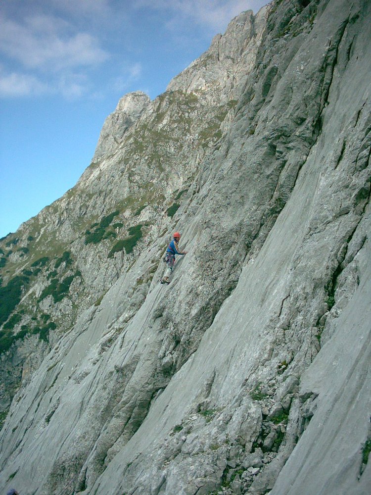 Großteils traumhafte anspruchsvolle Plattenketterei, 4. SL. 10 m brüchig (einige BH). Die Route wurde von unten durchstiegen und ist in den Plattenstellen mit BH sehr gut abgesichert. Alle BH wurden aus der Kletterstellung gesetzt.