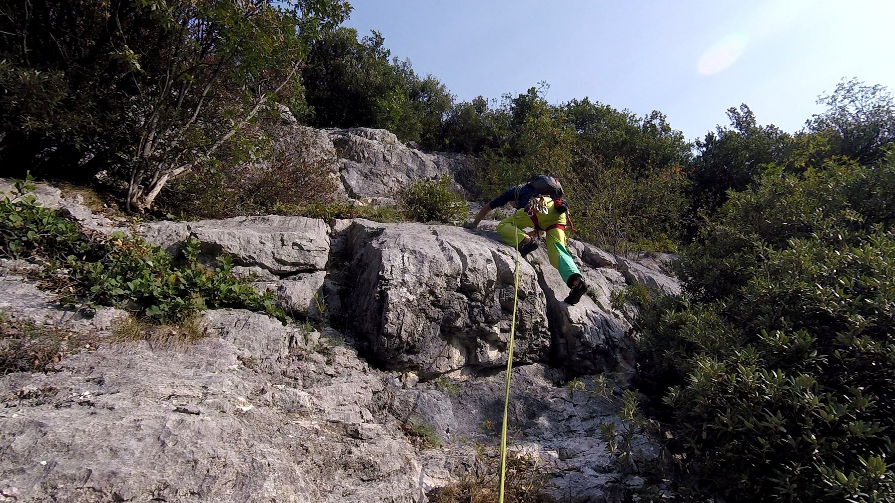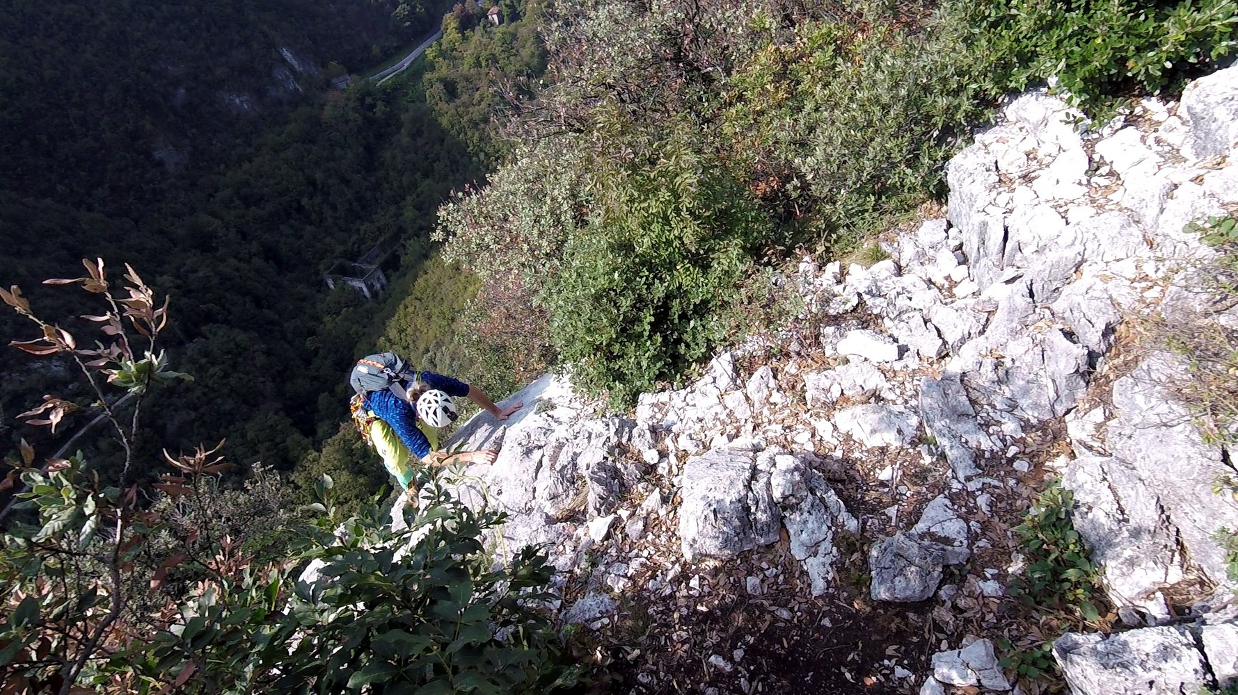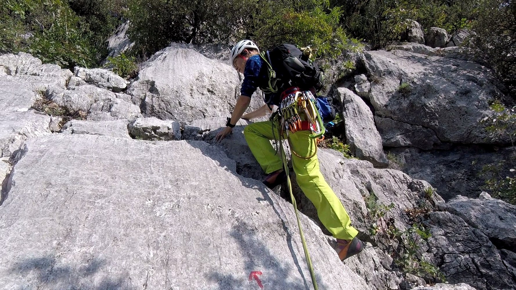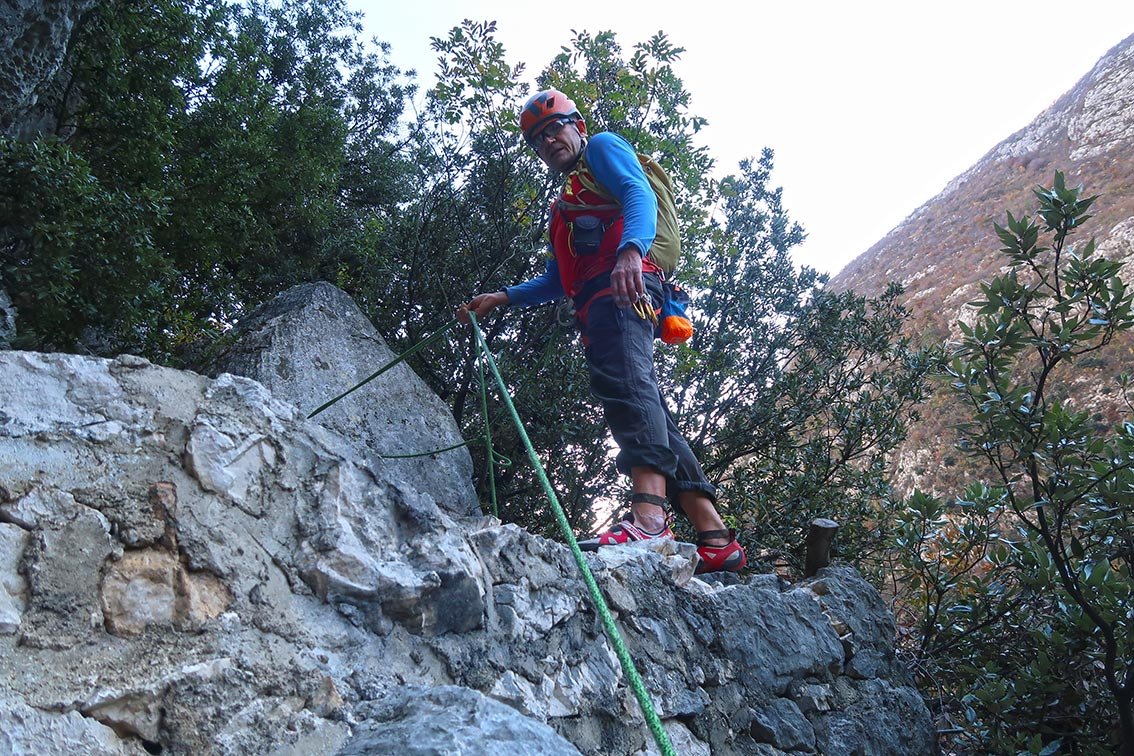 Vom Parkplatz auf der Straße zum Tunnel zurück und rechts davon auf der alten Ponale Straße (anfangs verläuft diese durch kurzen Tunnel) bis zu einer Schranke mit Fahrverbot. Auf der Straße noch etwas weiter bis zu einem Steinschlagnetz - dahinter beginnt ein Pfad aufwärts. Auf diesem hinauf, man kommt zum Pfeiler mit der Caino e Abele Route. Dort kurz wieder nach links, entlang des Pfeilers etwas aufwärts bis zum Einstieg (ist angeschrieben).