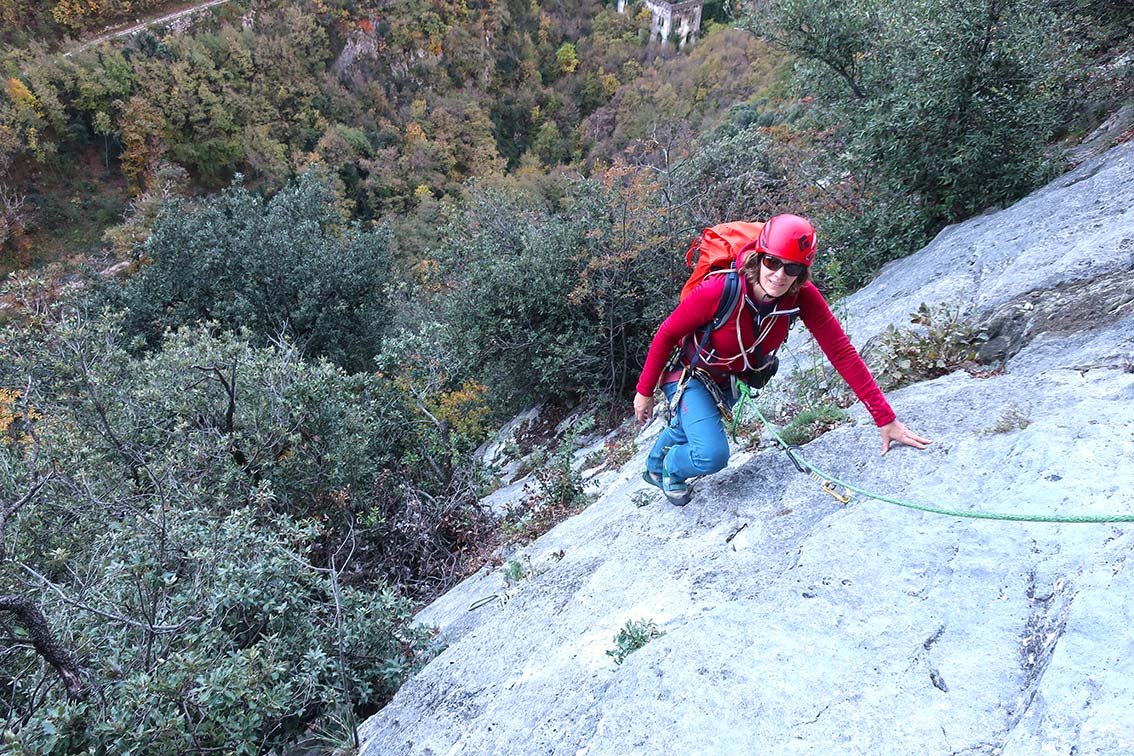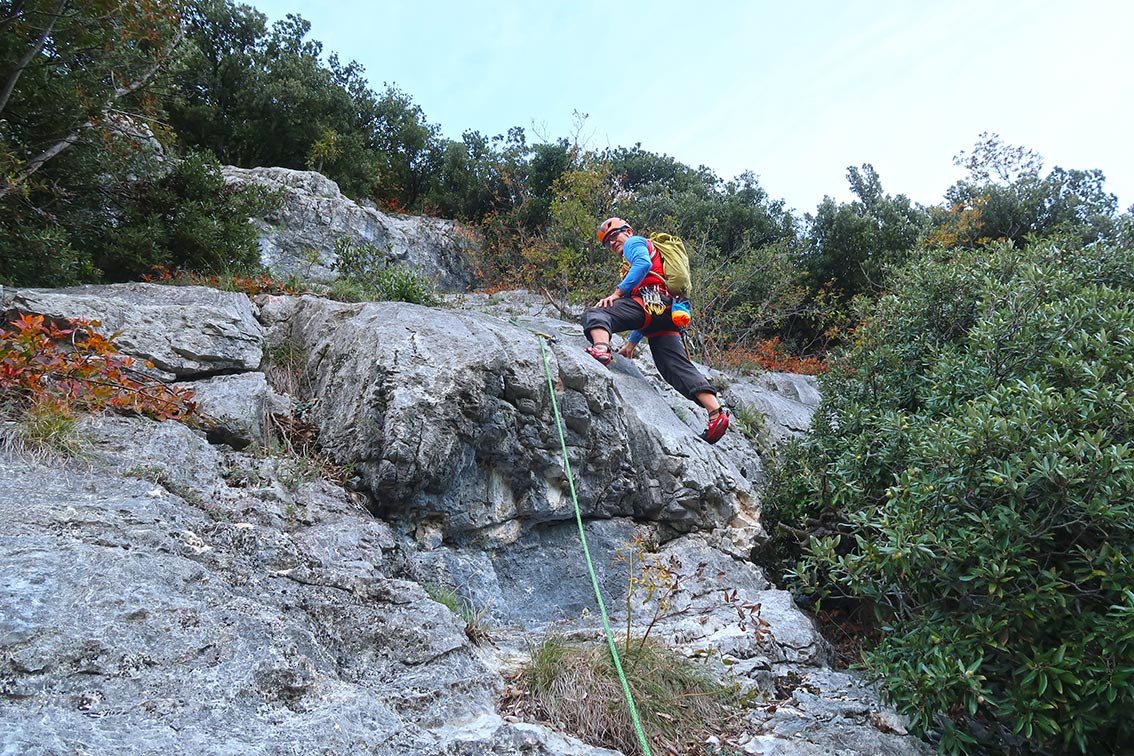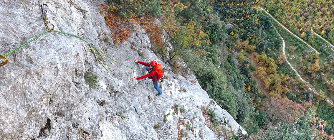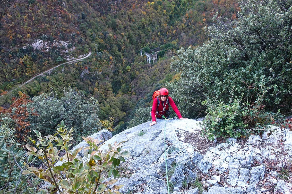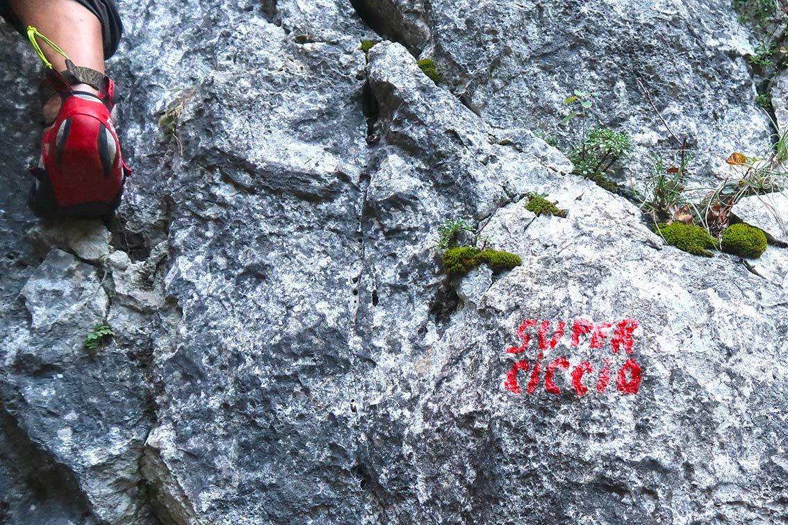 Vom Parkplatz auf der Straße zum Tunnel zurück und rechts davon auf der alten Ponale Straße (anfangs verläuft diese durch kurzen Tunnel) bis zu einer Schranke mit Fahrverbot. Auf der Straße noch etwas weiter bis zu einem Steinschlagnetz - dahinter beginnt ein Pfad aufwärts. Auf diesem hinauf, man kommt zum Pfeiler mit der Caino e Abele Route. Dort kurz wieder nach links, entlang des Pfeilers etwas aufwärts bis zum Einstieg (ist angeschrieben).