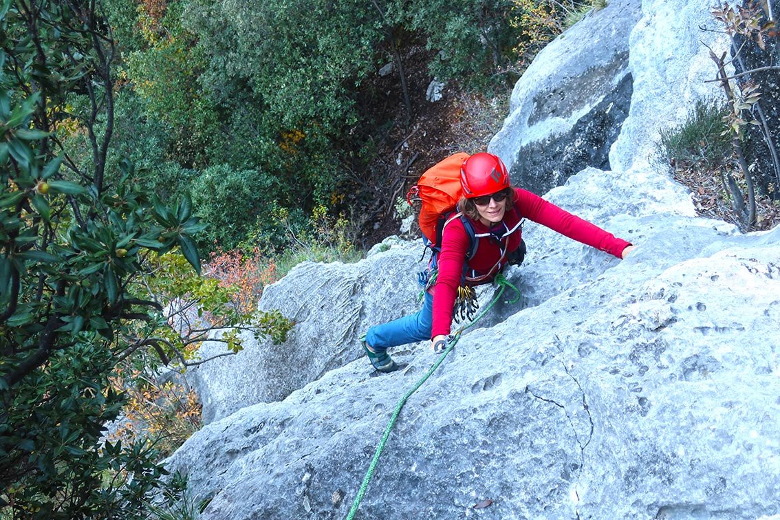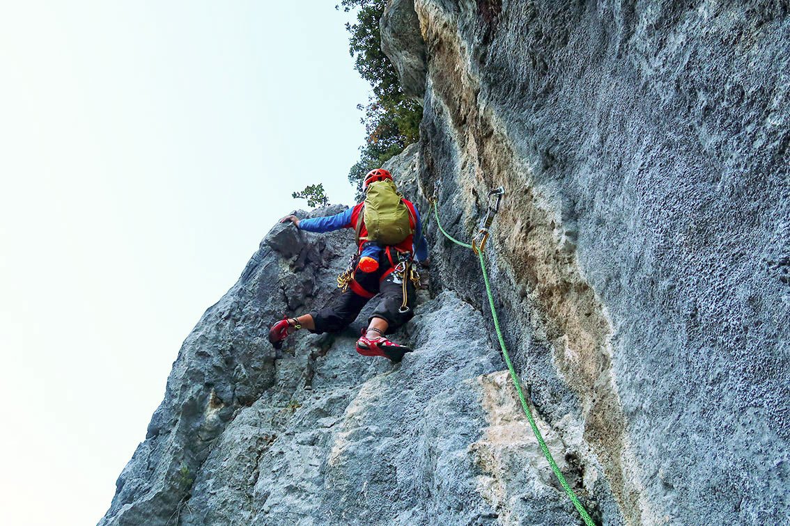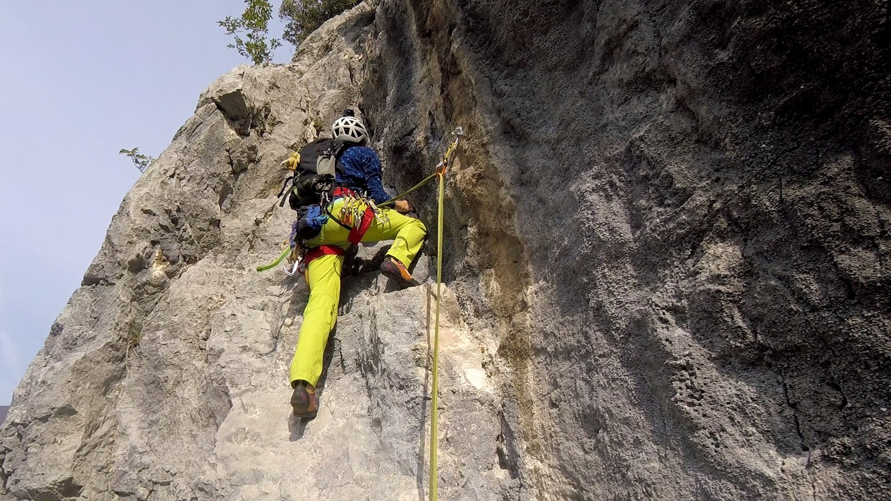 1 x 60 m Einfachseil, 10 Expressschlingen und Helm.