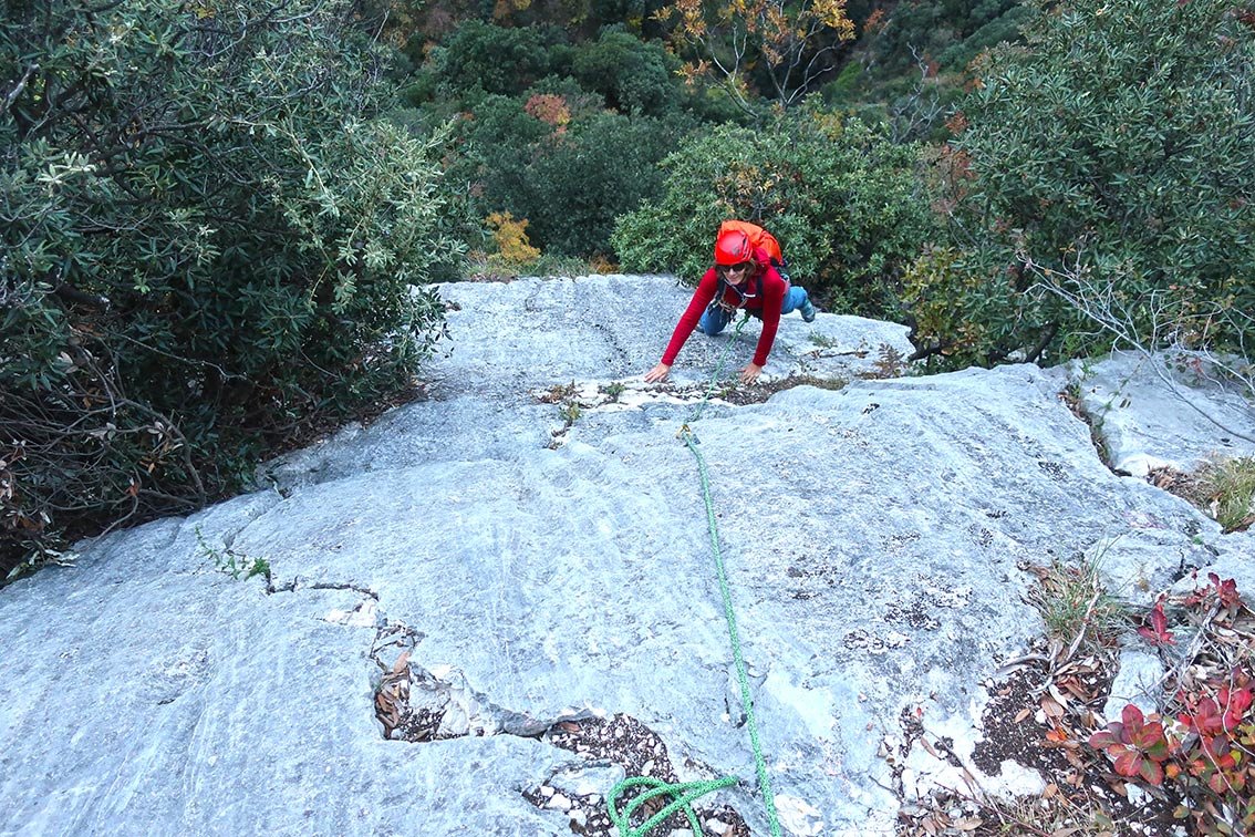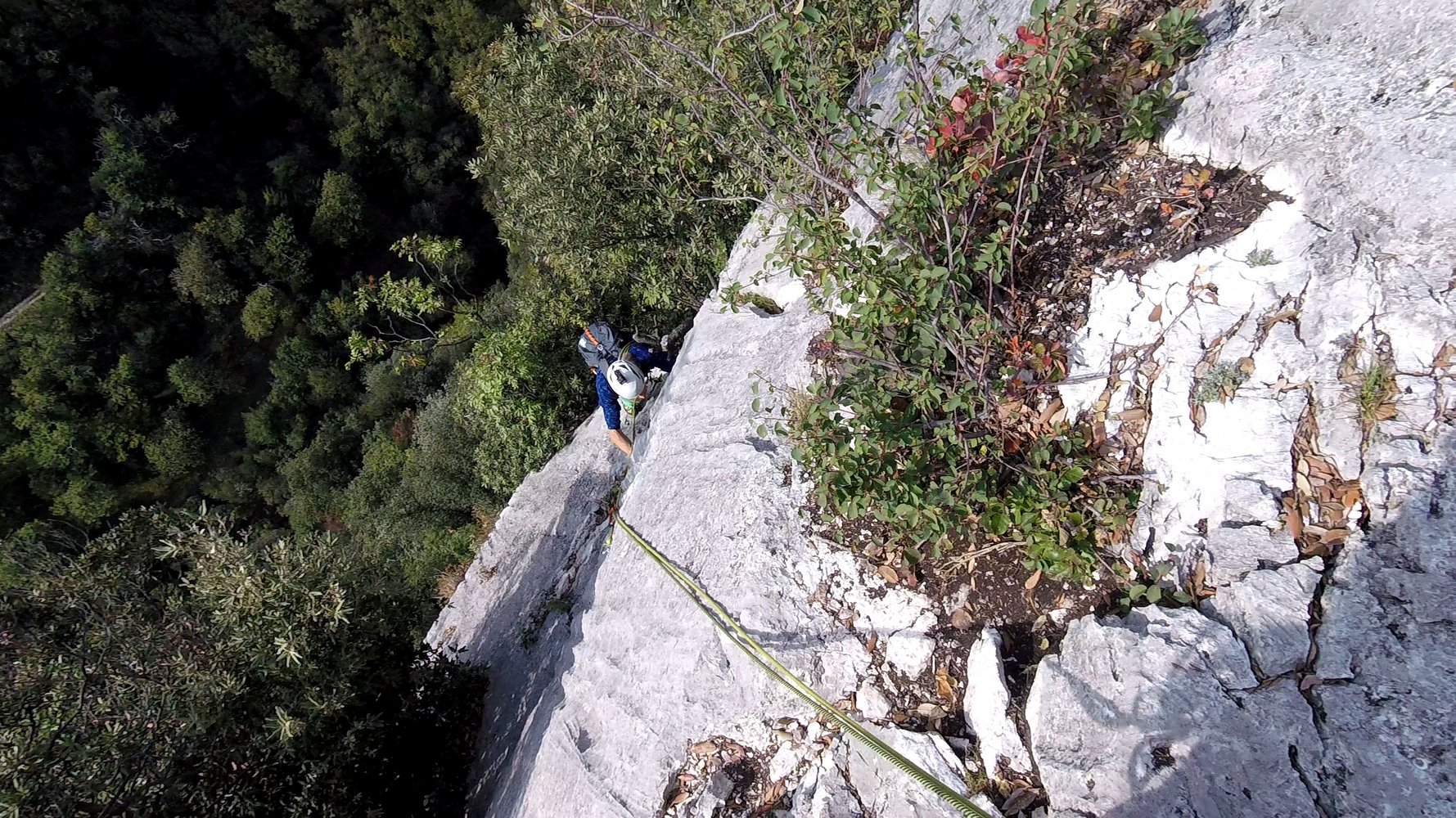 Oben nach links, dann auf einem Pfad hinunter zur Ponalestraße und auf dieser zurück zum Parkplatz. Wenn man noch eine andere Tour klettern will, kann man oben rechts auf dem Schnellabstieg absteigen (steiler Pfad mit alten Steinstufen).