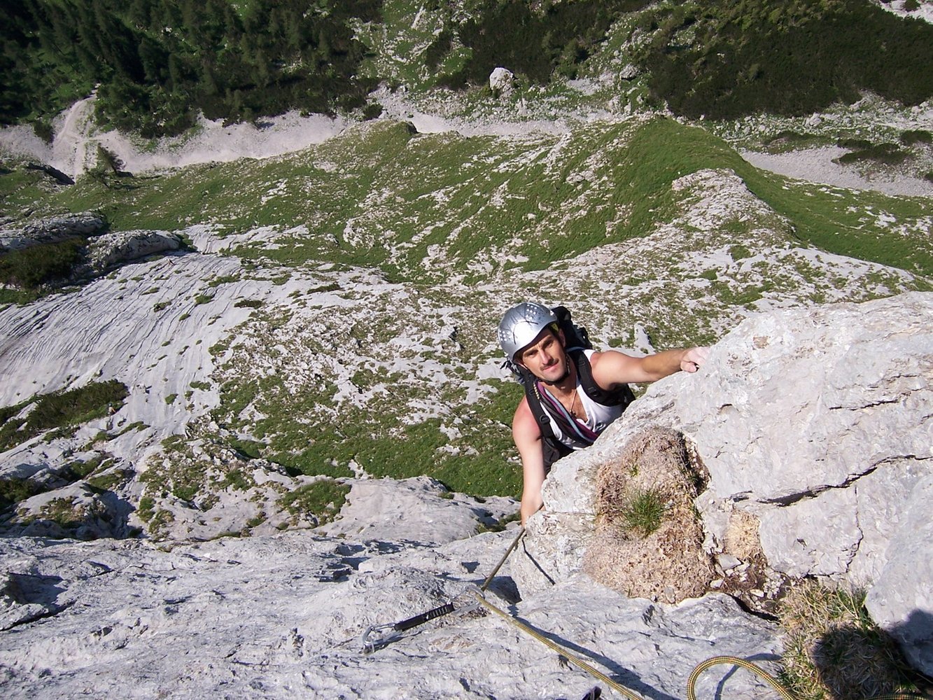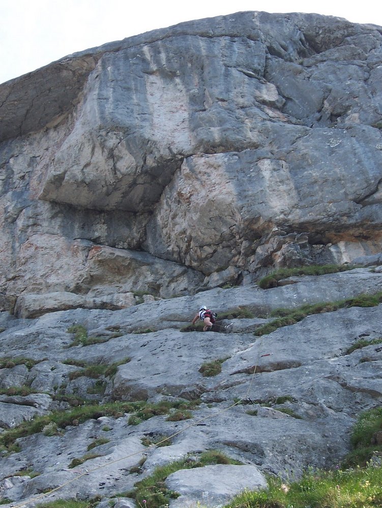 Vom Gipfel links ueber grosses Wiesenkar wieder unschwierig zum Einstieg (Rucksackdepo) zurück.