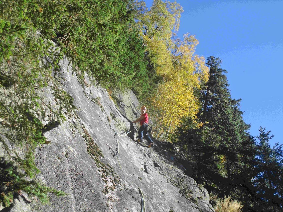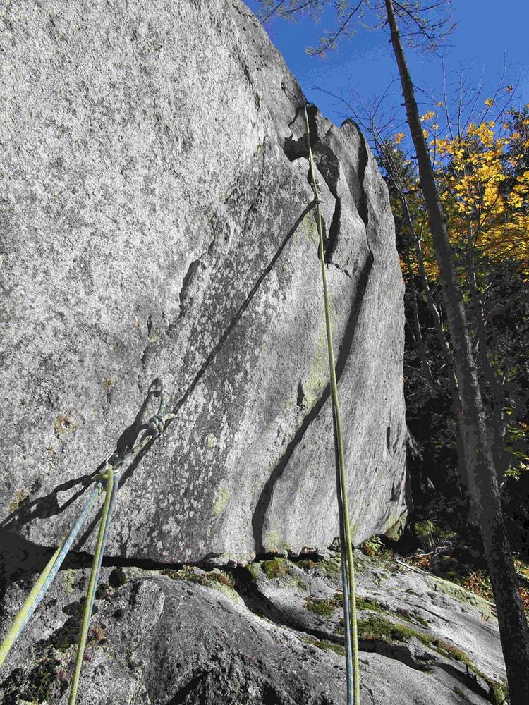 Bei Nässe oder Feuchtigkeit nicht einsteigen. Am besten sollte es staubtrocken sein (Flechten, Erde und Moos an den Felsen). Es gibt in diesem Bereich noch einige andere, lohnende Bohrhakentouren (siehe Übersichtsbild).
