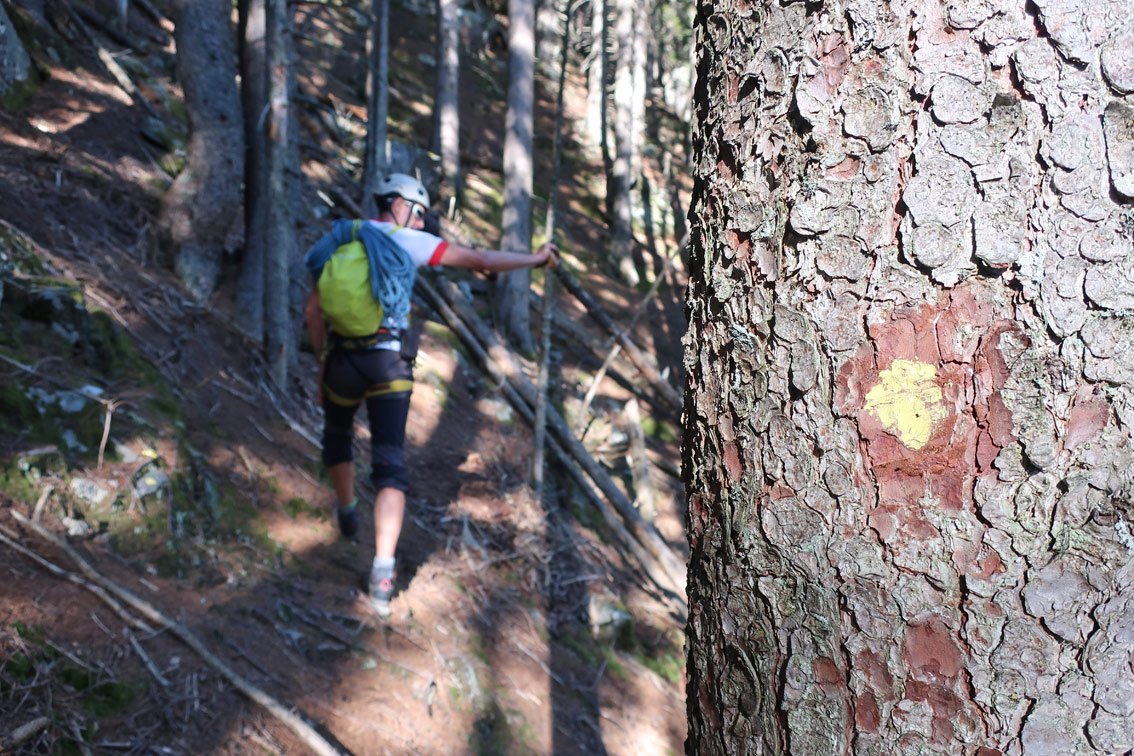 Nach rechts, Pfadspuren (gelbe Punkte beachten), durch den steilen Wald, einmal leicht aufsteigen, bis zu einem Jägersteig. Auf diesem abwärts zu einer steilen Wiese. Rechts im Wald oder auf der Wiese ca. 70 Hm bis zu einem Hochstand (in Abstiegsrichtung rechts) absteigen. Ca. 10 Hm darunter, bei einem Leckstein, rechts in den Wald und zur Felswand. An dieser entlang zurück zum Einstieg (gelbe Punkte).