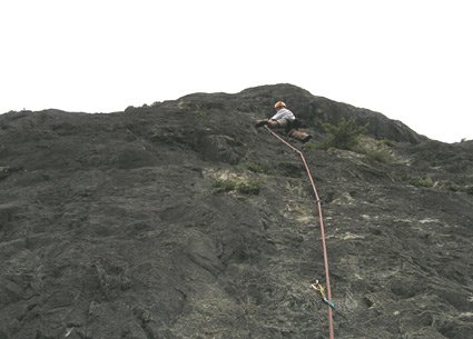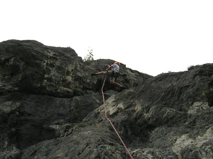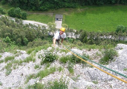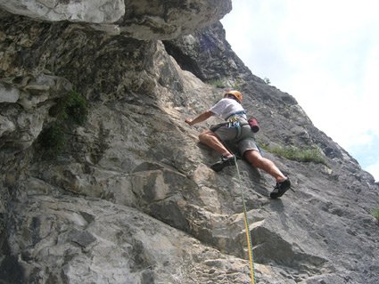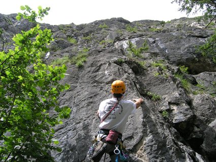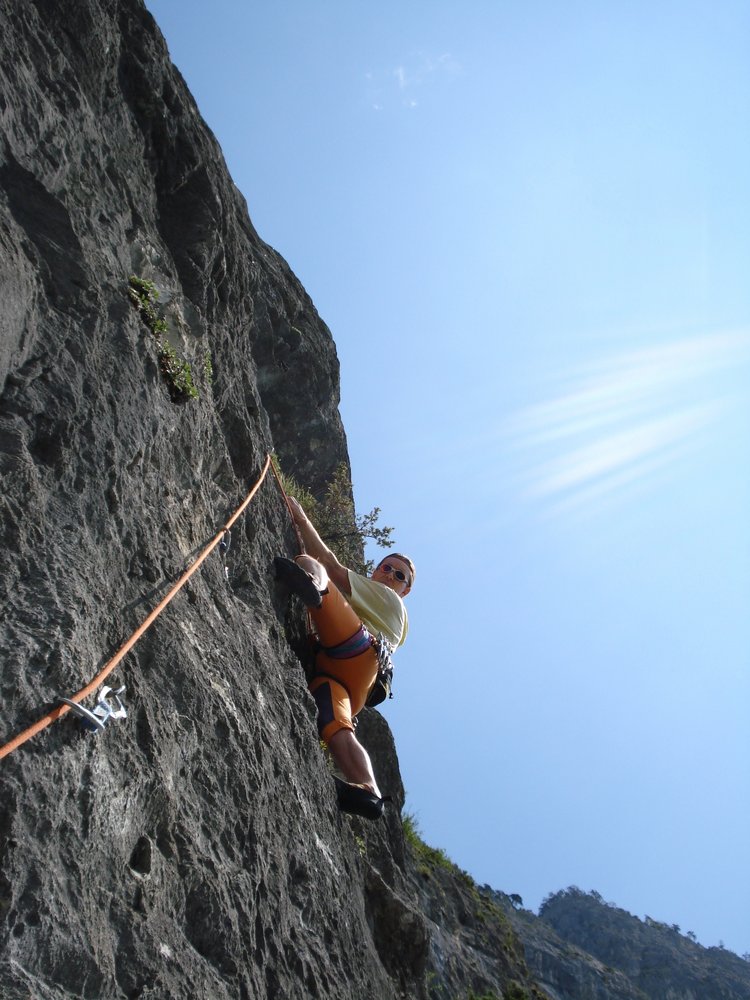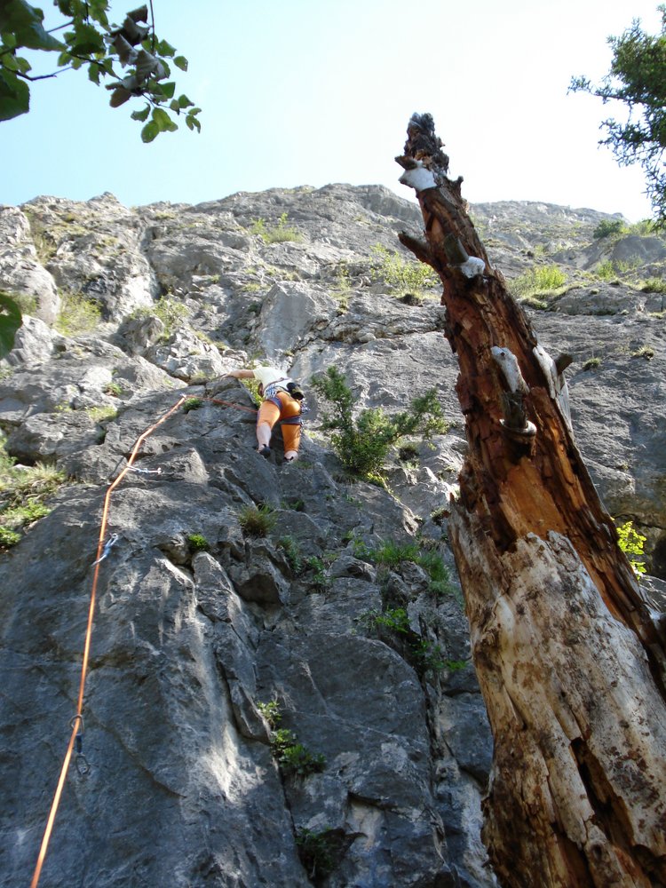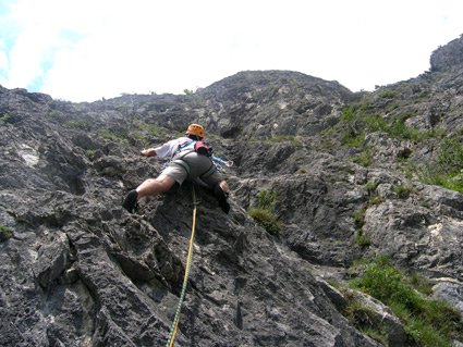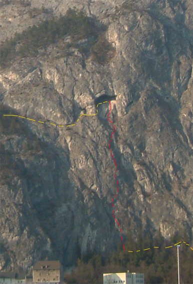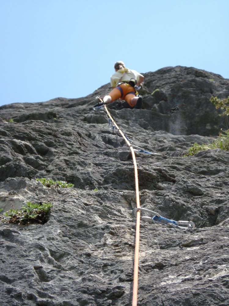 Diese leider etwas inhomogene Route verläuft links des Klettersteiges bis zur Max Grotte. Die ersten 3 Seillängen sind brauchbar (sehr gute steile Plattenkletterei in der 3ten Seillänge). Die drei Ausstiegslängen sind aber nicht zu empfehlen (viel Gras und lose Steine).