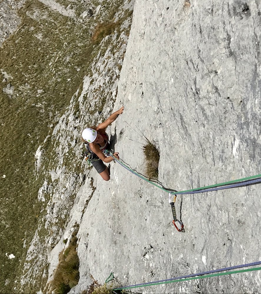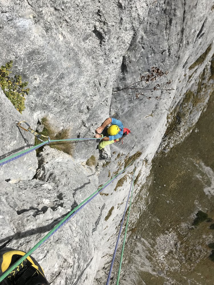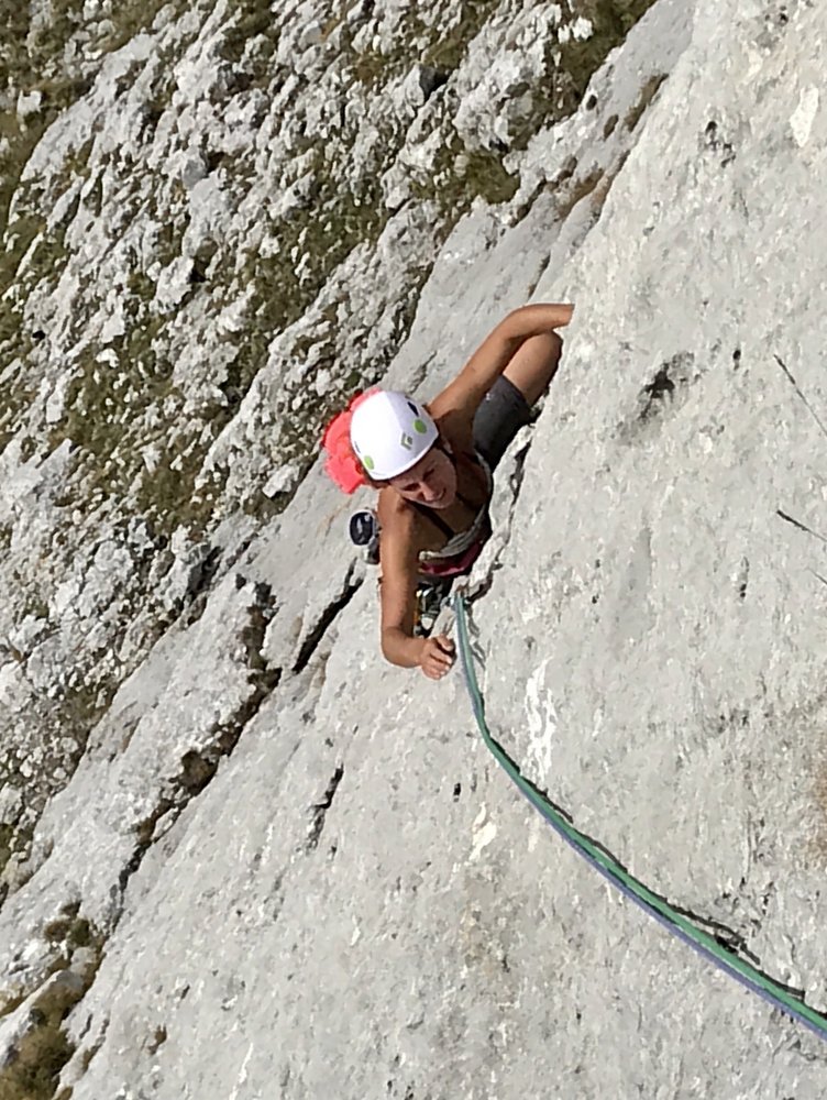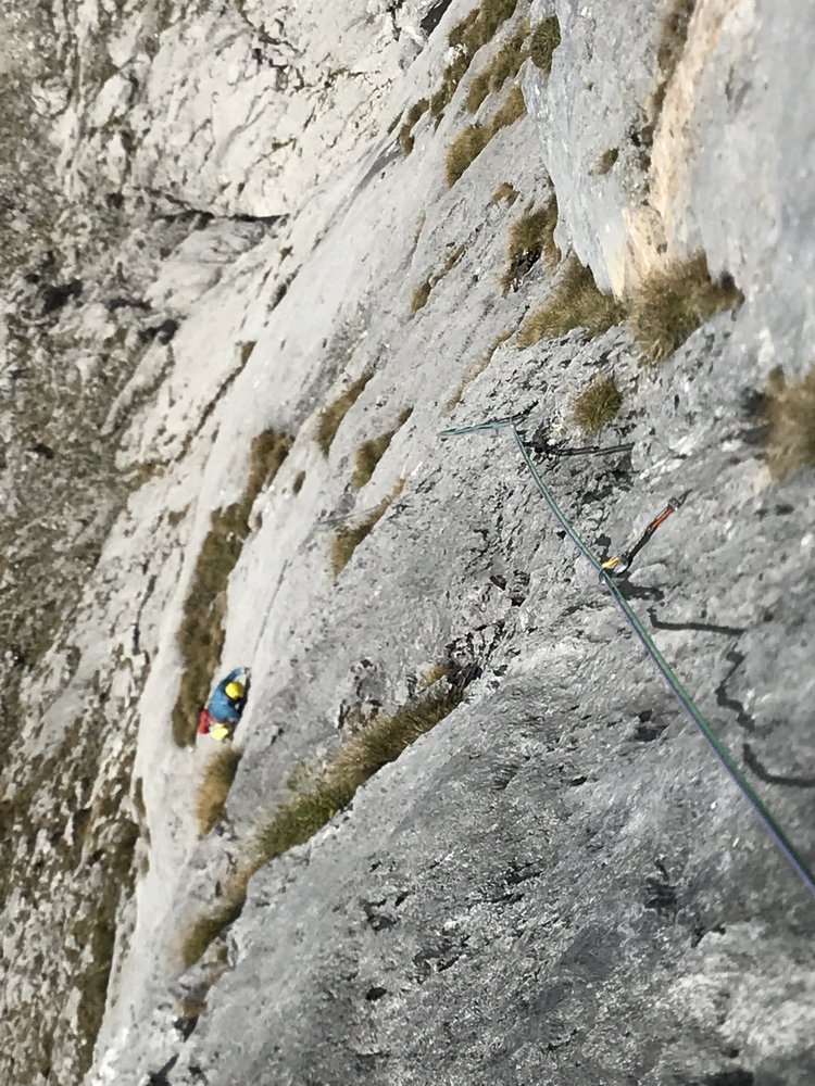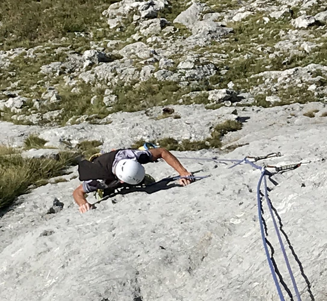 Kurze alpine Sportklettertour (insgesamt 4 Touren nebeneinander mit bis zu 5 SL) mit teilweise längeren Hakenabständen