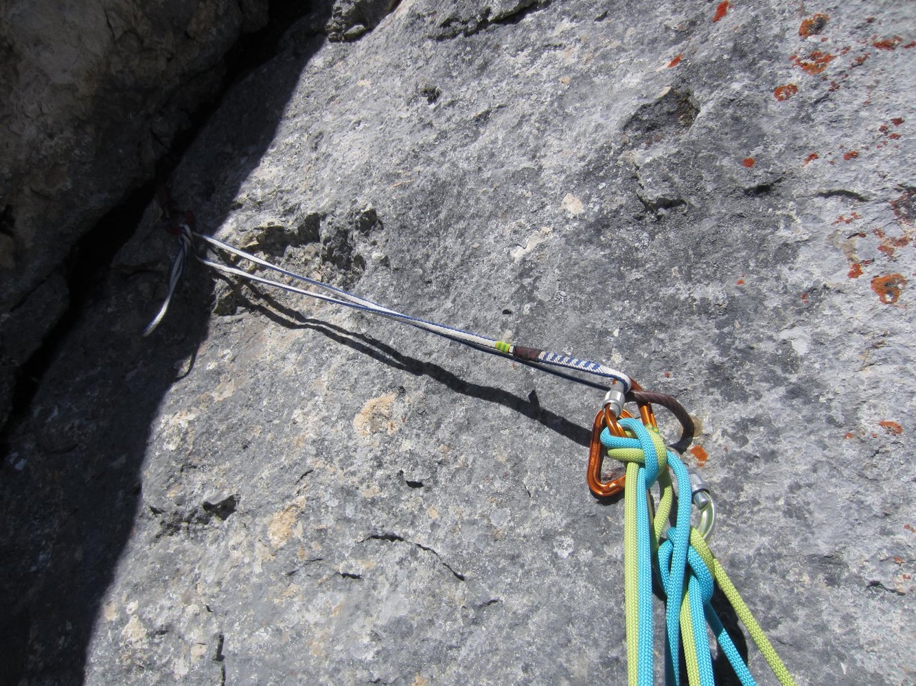 Route mit Bohrhaken durchgesichert, wobei teilweise älteres Material vorhanden ist.