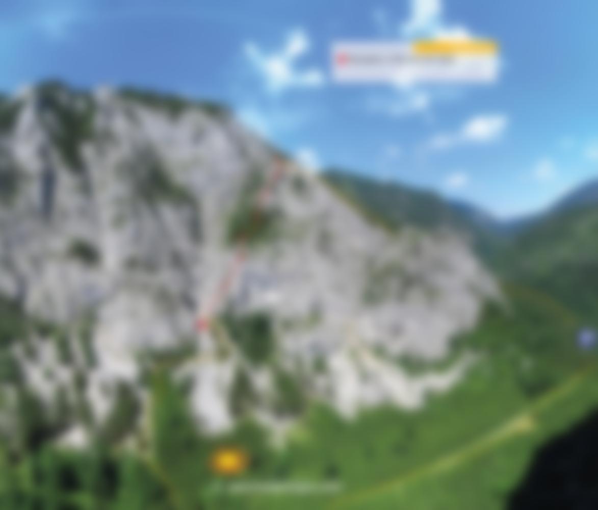 Vom Parkplatz kurz zurück Richtung Weichtalhaus und bei einem Zaun mit Tour auf einer Anfangs asphaltierten Straße ins Höllental. Nach dem ersten ansteigend Waldstück wird die Forststraße flach (links eine Wiese). Weiter bis die Forststraße wieder leicht ansteigt, hier (kurz davor ist rechts im Wald ein rot markierter Baum) geht rechts eine Steigspurt über die Wasserleitung in den Wald und führt steil über Geröll hinauf zu einem Querweg ca. 10 Meter unter dem Wandfuß diesem ca. 100 m nach rechts unter den Einstiegskessel folgen und über Geröll steil zum Einstieg.