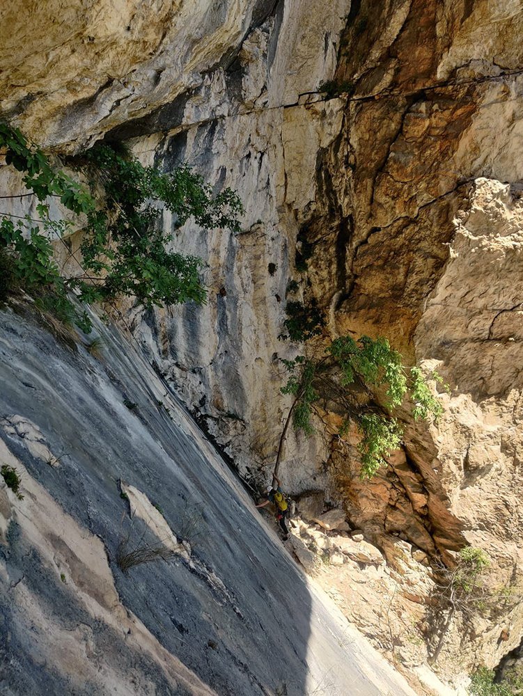 Die Tour ist komplett durchgebohrt - ab und an sind ganz kurze Freikletterstellen, die sind aber nicht allzu schwierig. (Nach dem Dach die letzten 2 m zum Stand, in der letzten SL die letzten 3 m zum Stand und in der ersten SL bis zum Grasband.)