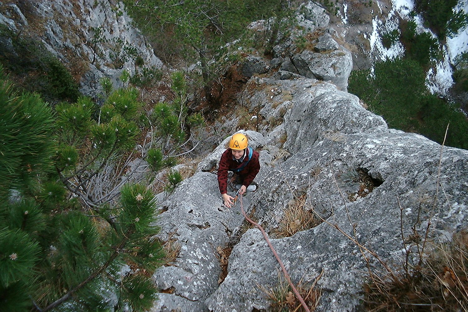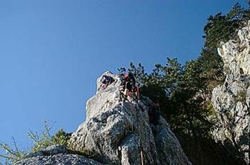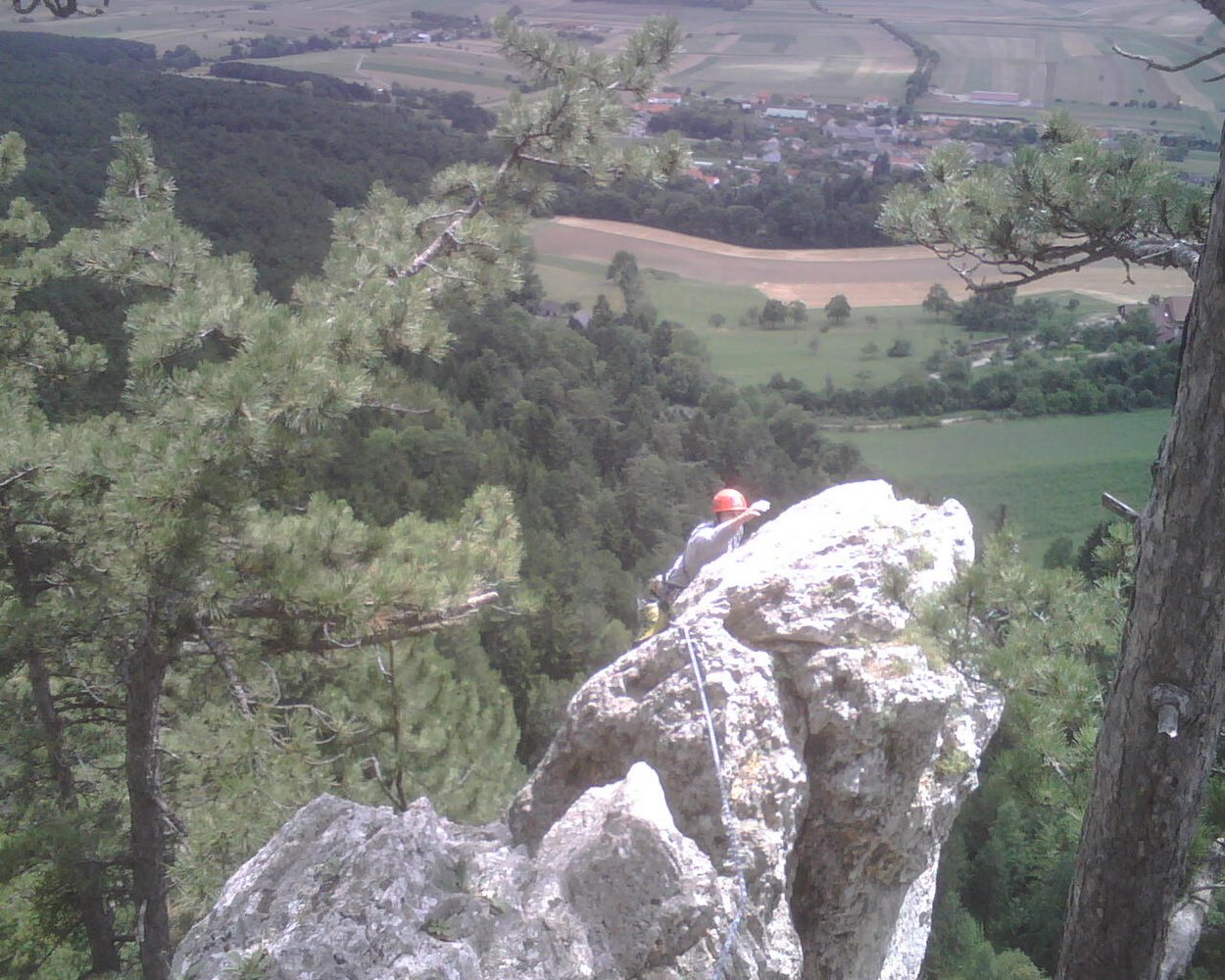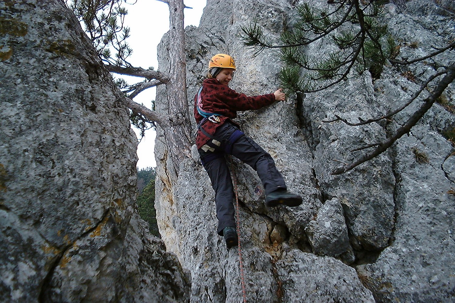 Dieser nette Gratanstieg zählt zu den beliebtesten Hohe Wand Routen. Die Route hat geringe Schwierigkeiten (3) und ist mit Bohrhaken abgesichert. Der Fels weist einige interessante und teils etwas ausgesetzte Kletterpassagen auf. Es gibt auch eine direkte Variante an der Kante, die mit 5- zu bewerten ist.
