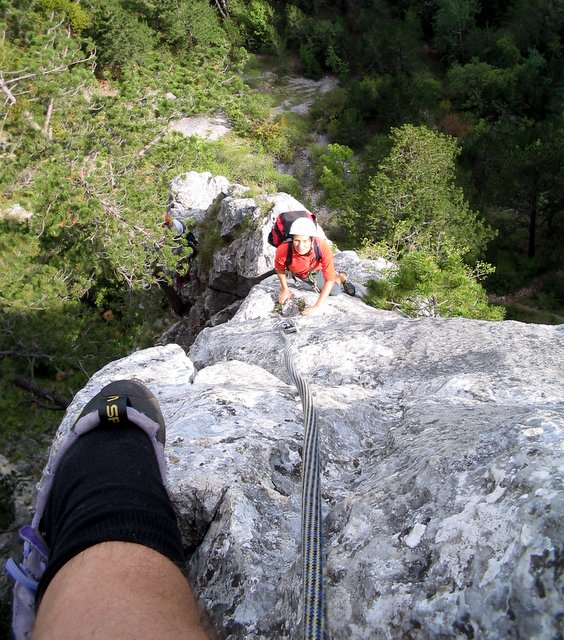 Einfachseil, 5 Express Schlingen, Bandschlingen, Sanduhrschlingen und einen Satz KK. Es gibt zum Teil Klebebohrhaken an den Ständen und dazwischen.
