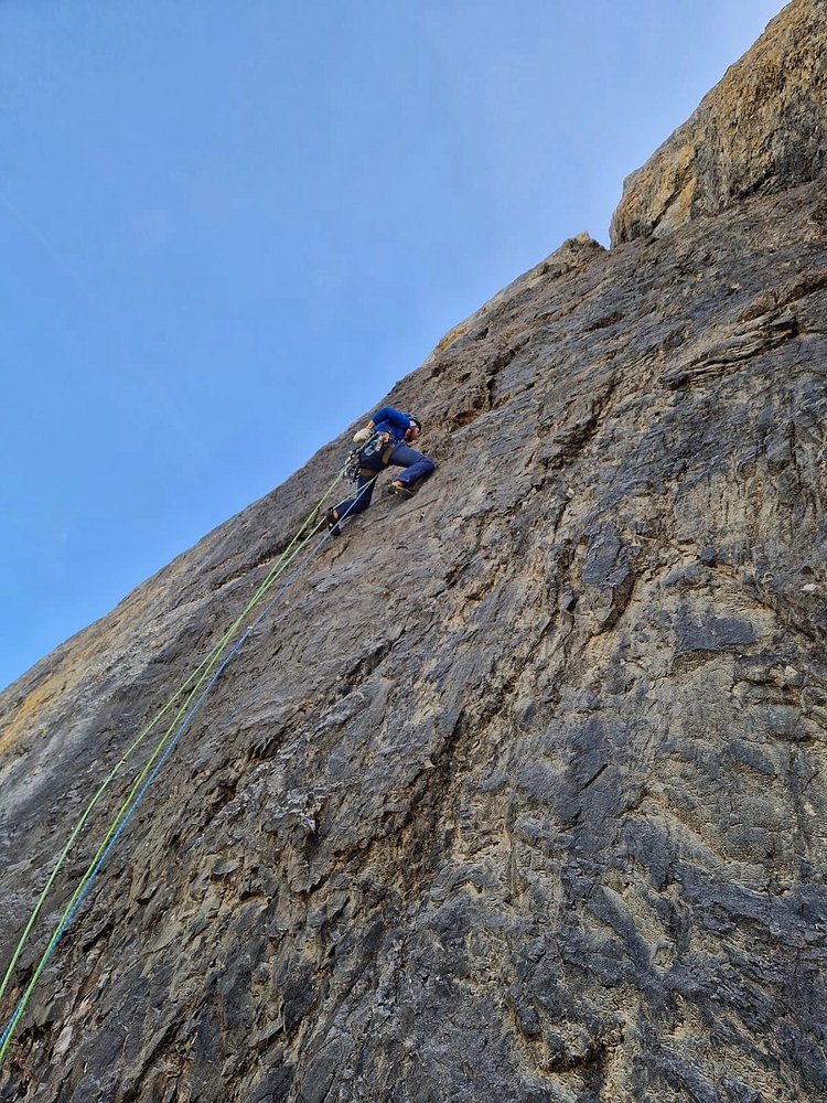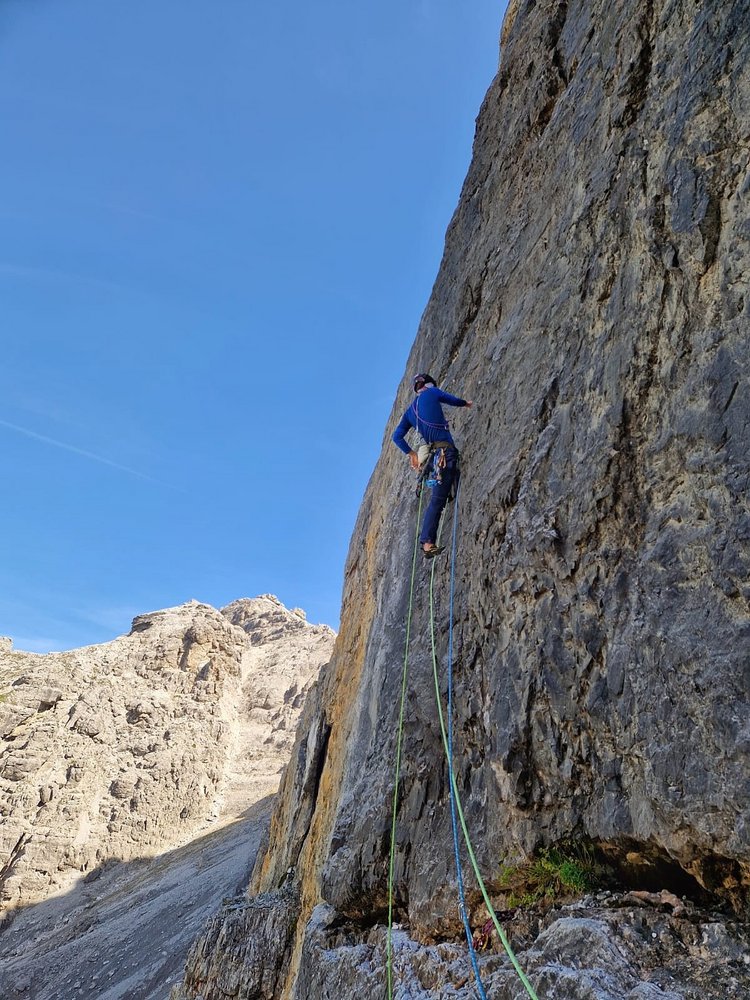 3.+4. SL : Das Herzstück - anspruchsvolle unübersichtliche Wandkletterei (VII-) in schönem schwarzem Fels zu einem markanten Riss - dem eine Schuppe folgt - danach gerade hoch zu Stand der "King Crimson". (Standplatz je nach Materiel / Moral)