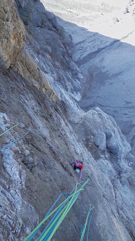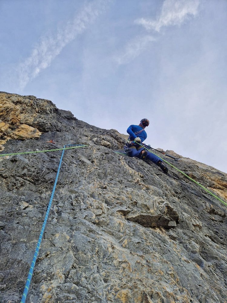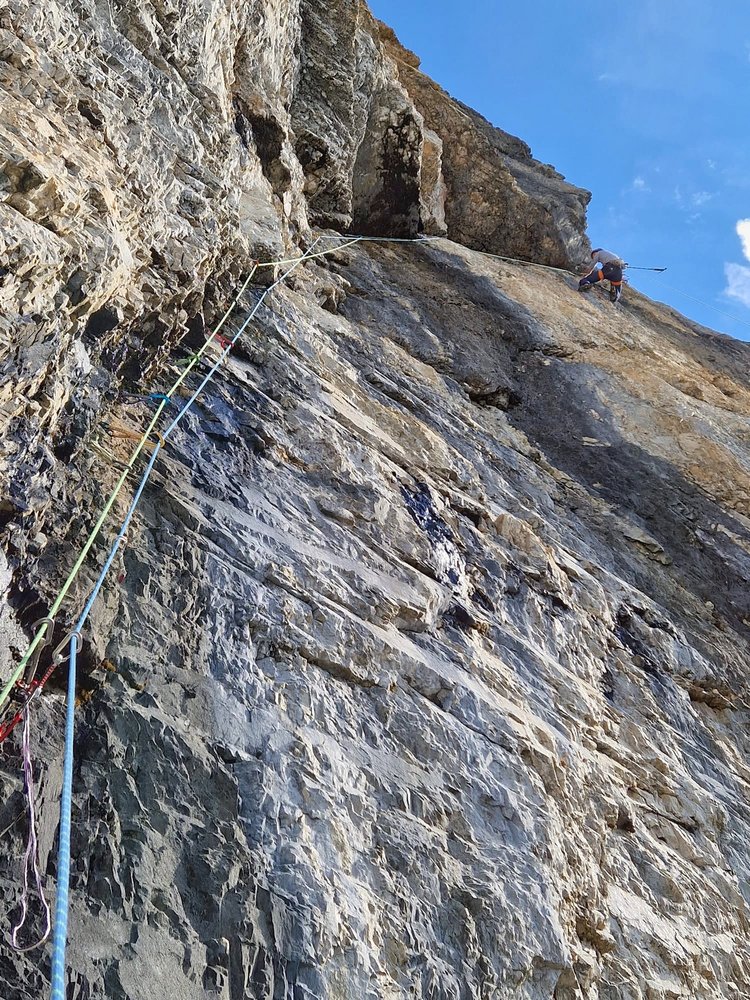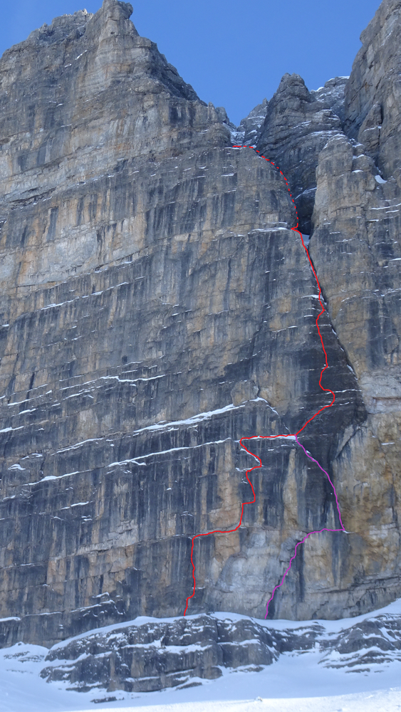 1. SL: Einstiegsüberhang der "King Crimson" VIII+ oder A0 bzw. A1 - danach nicht zum Stand der ersten Sl der King Crimson sondern auf markantem Band nach rechts zu einem Schlaghaken am Beginn einer brüchigen Verschneidung.
