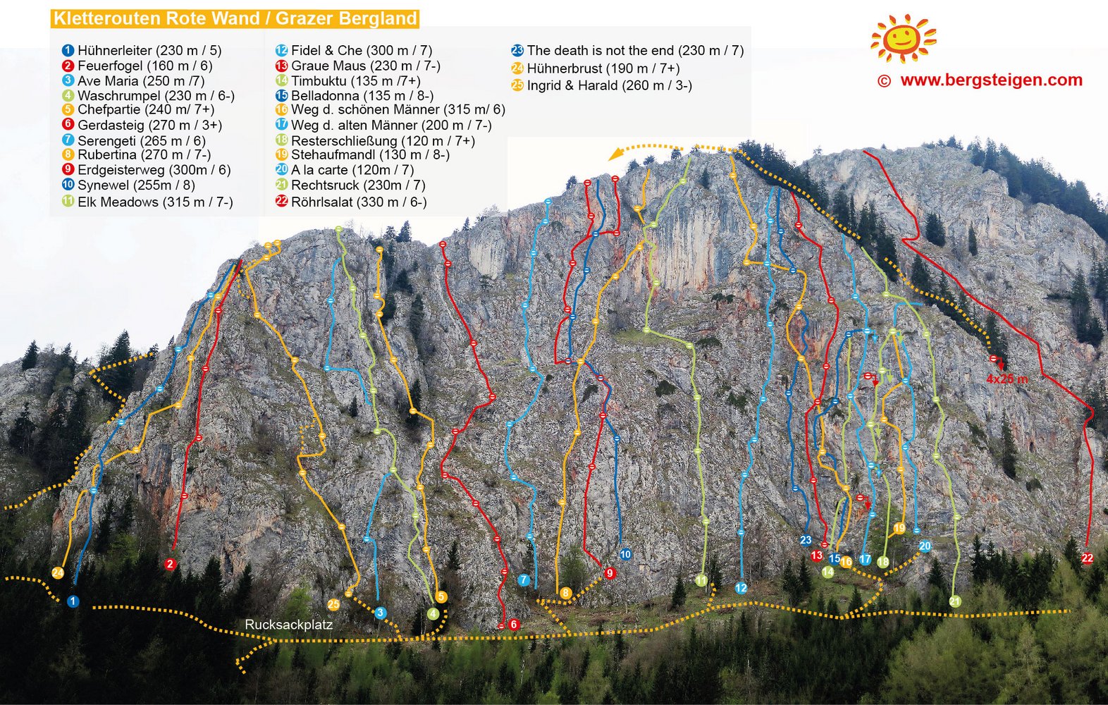 Sehr schöne Route im rechten Teil der Zentralen Roten Wand, der Routenname wurde in Erinnerung an die Erstbegeher, die am Dachstein tödlich verunglückten und zu den wichtigen Erschließern des Grazer Bergland gehörten, gewählt. Die Kletterrei ist perfekt und bietet auf den rd. 230 Metern konstante Schwierigkeiten. Die Route ist trotz der Bolt anspruchsvoller gesichert.