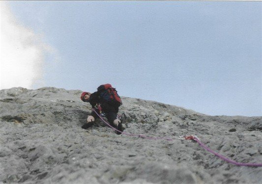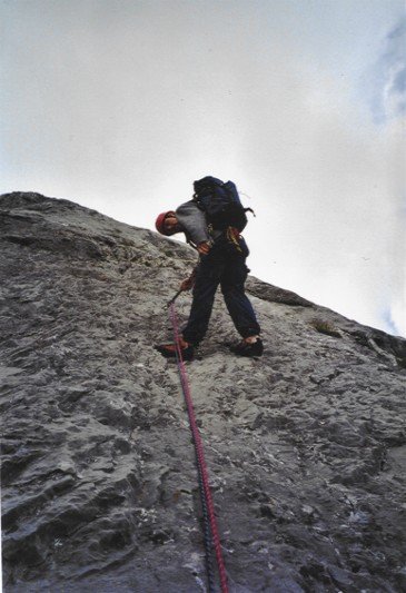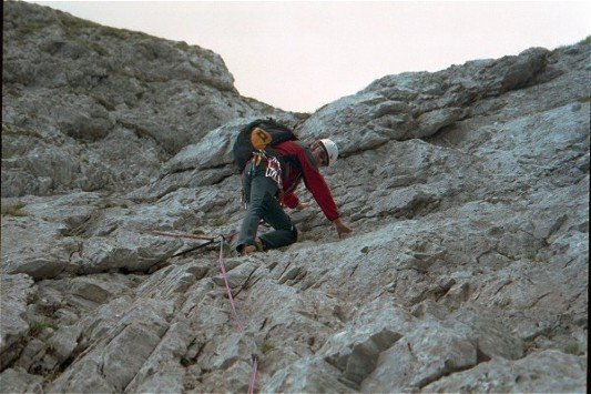 Die Route wurde durch die Erstbegeher saniert. Stand und Zwischenhaken geklebt. Insgesamt 8 Haken in der Route, also Alpinstil!