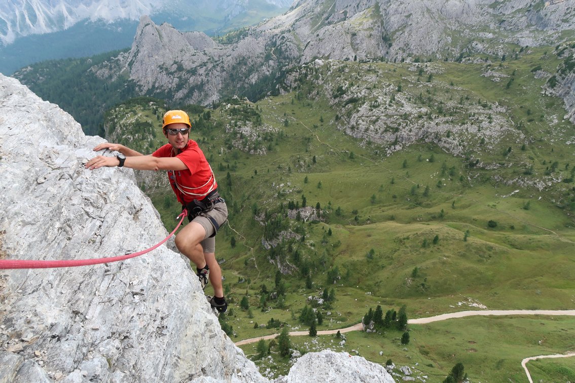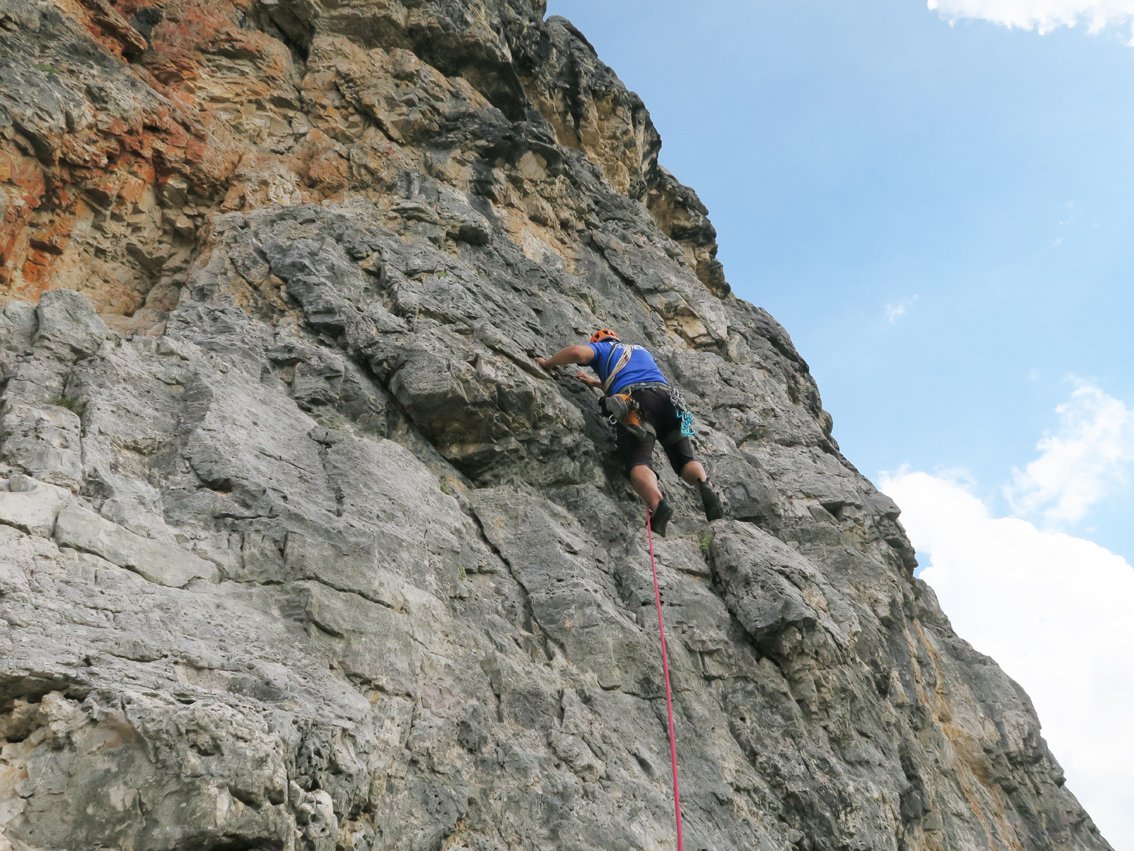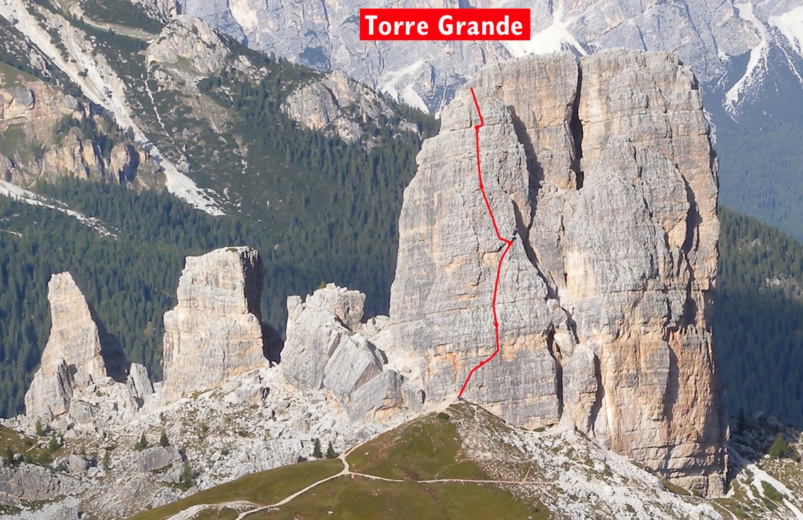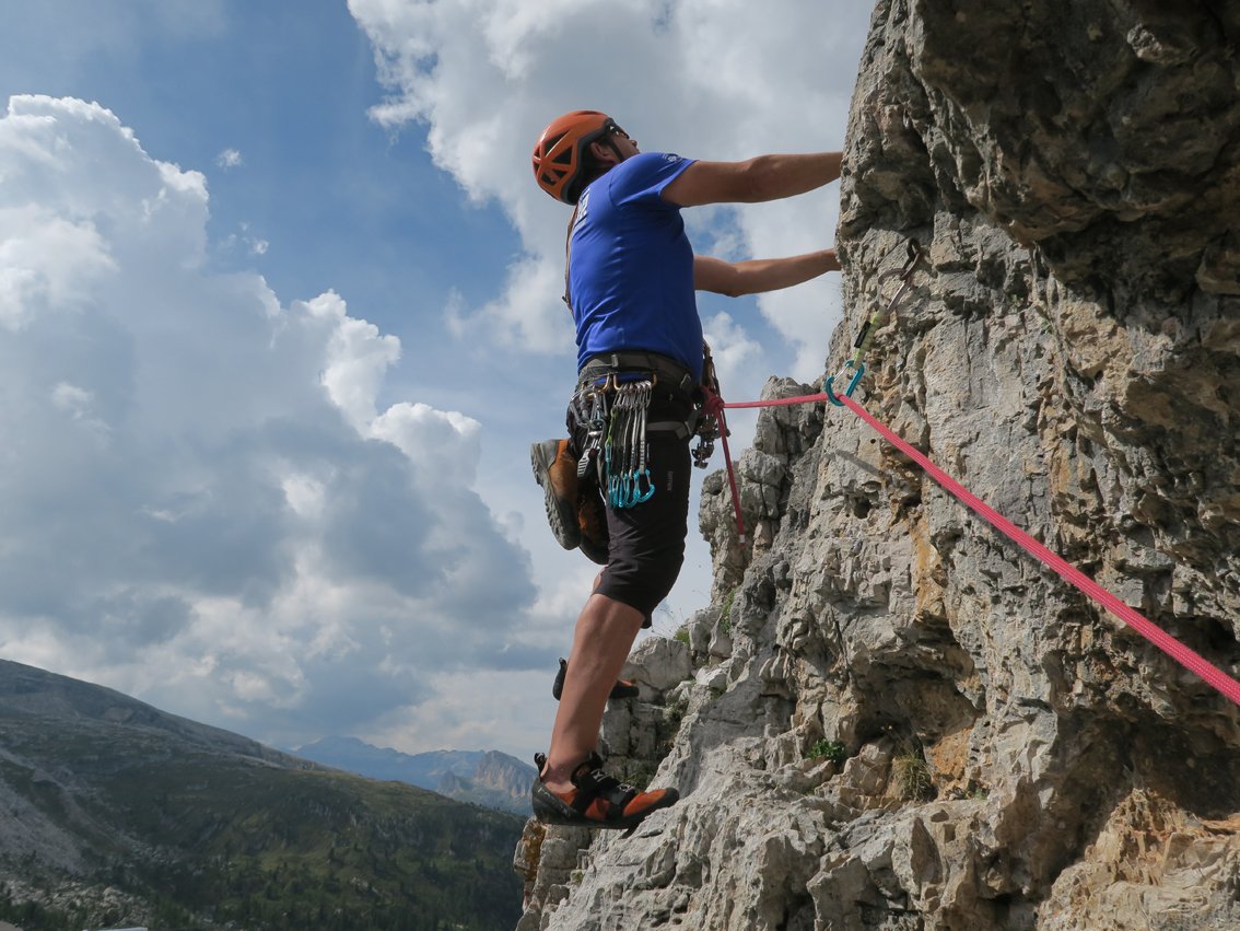 Eine der beliebtesten Touren im Gebiet der Cinque Torri ist der Anstieg an der Westseite des Torre Grande. Die Tour ist in der ersten Seillänge an einem Überhang kurz schwer (geht auch technisch), der Rest ist schöne Genusskletterei. Die Via della Guide ist nicht nur bei Bergführeren beliebt, in der Regel ist man nicht der einzige in dieser guten Route - wenn zu viel los ist, hat man aber an den Cinque Torri zum Glück genug Auswahl.