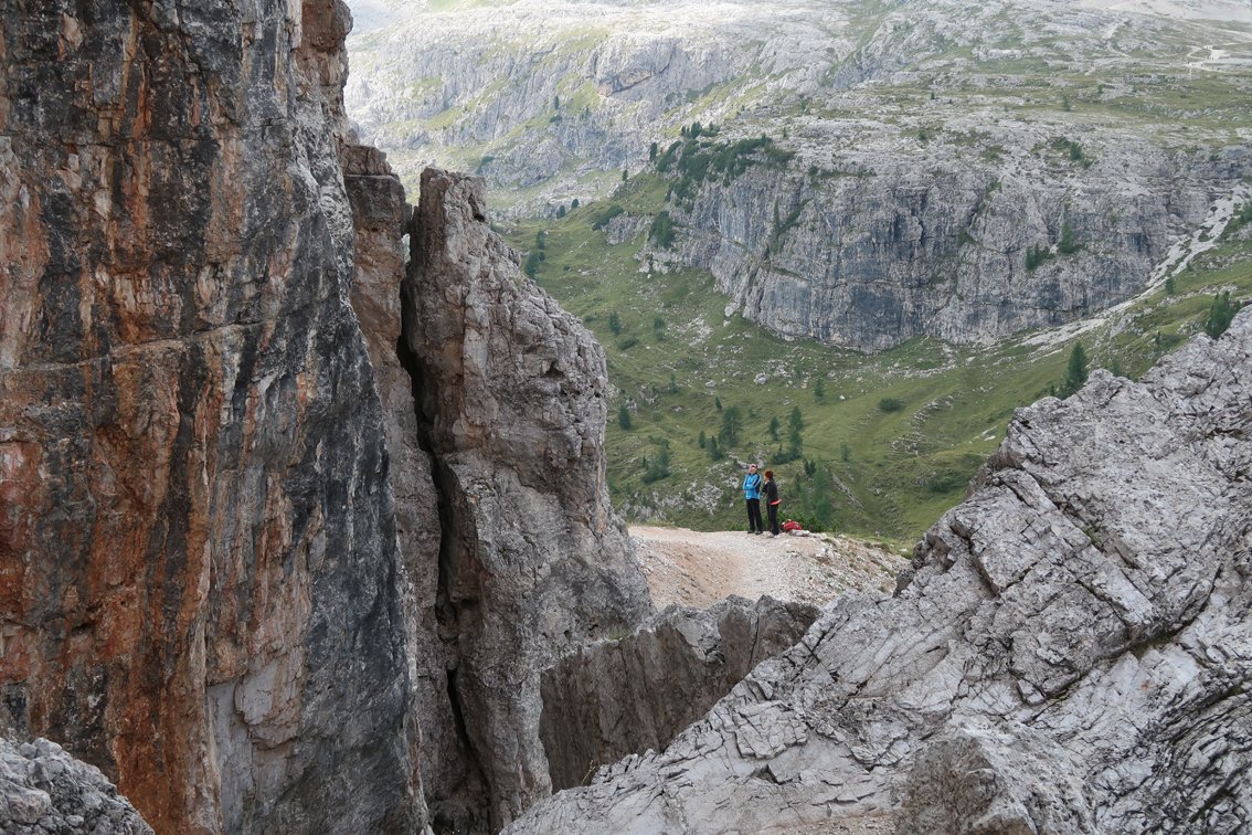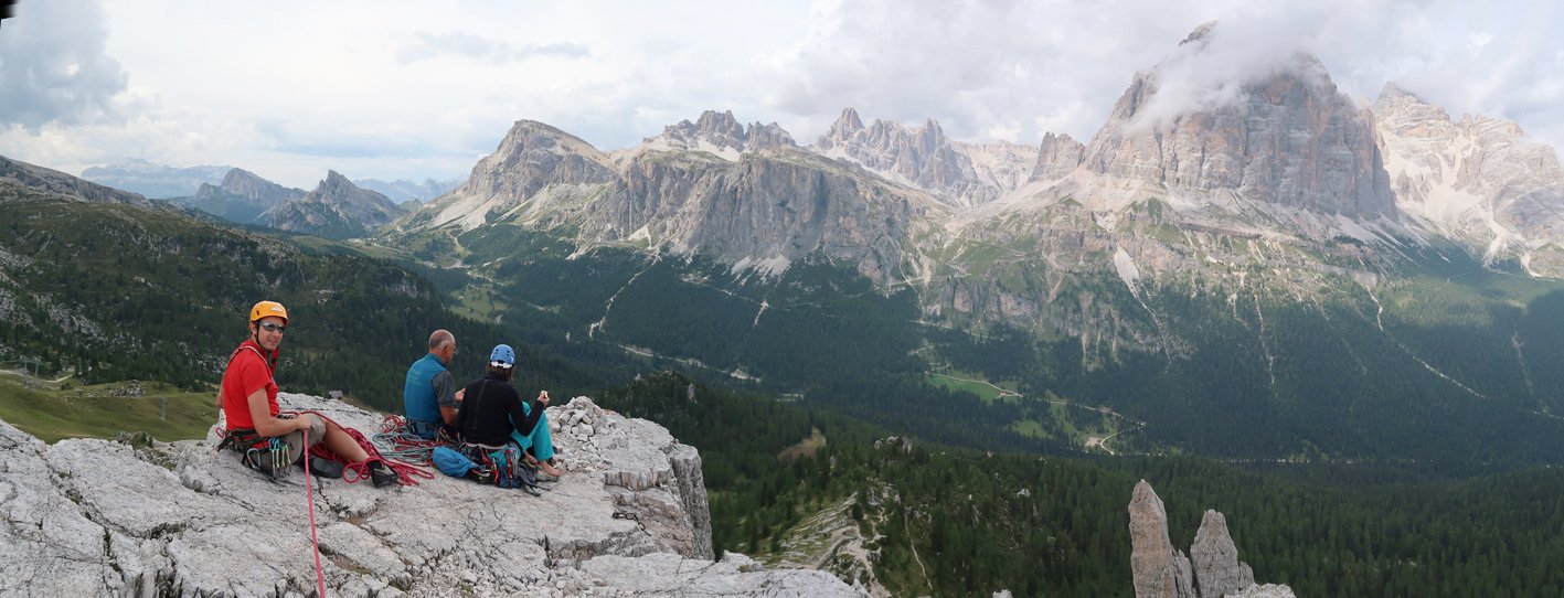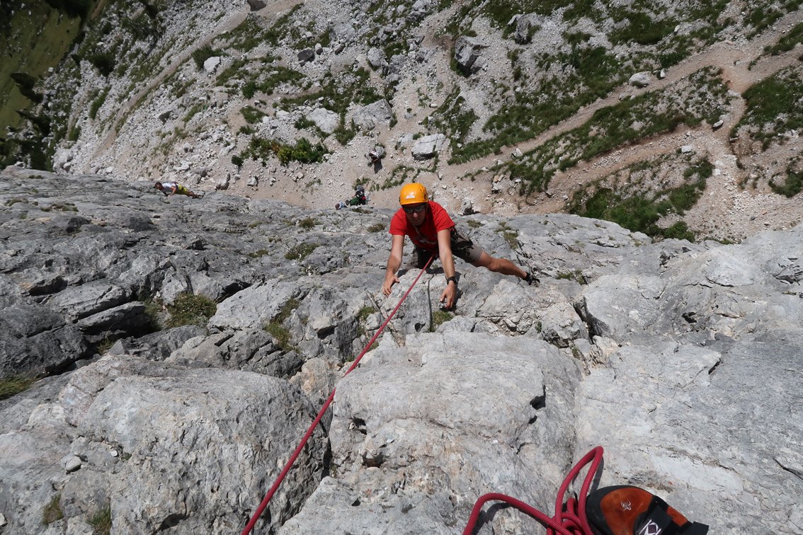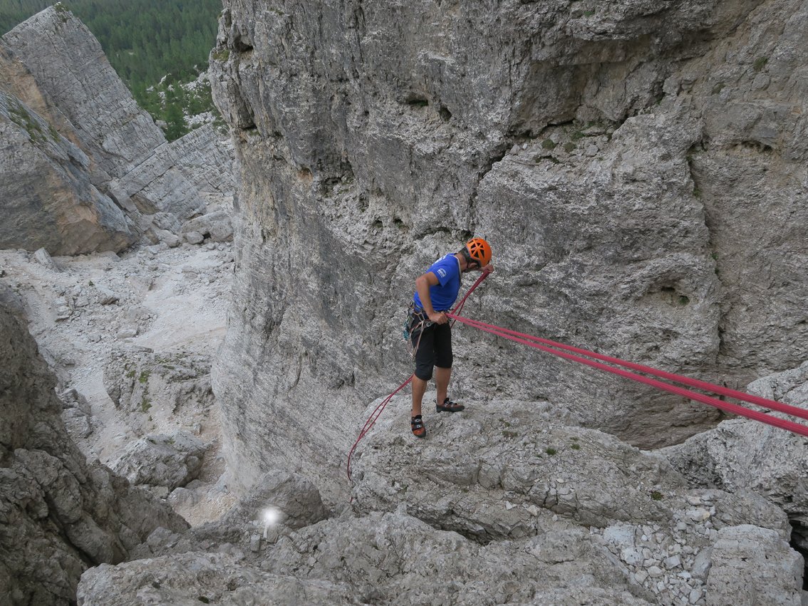 Eine der beliebtesten Touren im Gebiet der Cinque Torri ist der Anstieg an der Westseite des Torre Grande. Die Tour ist in der ersten Seillänge an einem Überhang kurz schwer (geht auch technisch), der Rest ist schöne Genusskletterei. Die Via della Guide ist nicht nur bei Bergführeren beliebt, in der Regel ist man nicht der einzige in dieser guten Route - wenn zu viel los ist, hat man aber an den Cinque Torri zum Glück genug Auswahl.