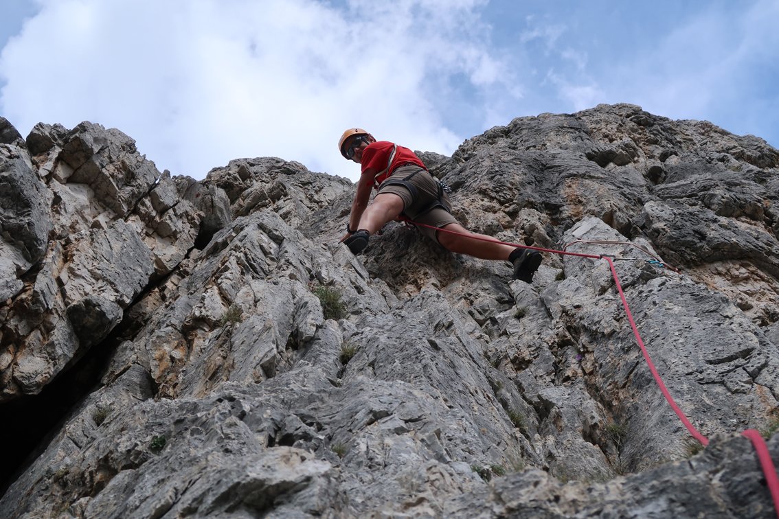 An den schweren Passagen (Überhang in der ersten Seillänge stecken vereinzelt Bohrhaken, den Rest der Tour muss man selber absichern (was sehr gut geht).