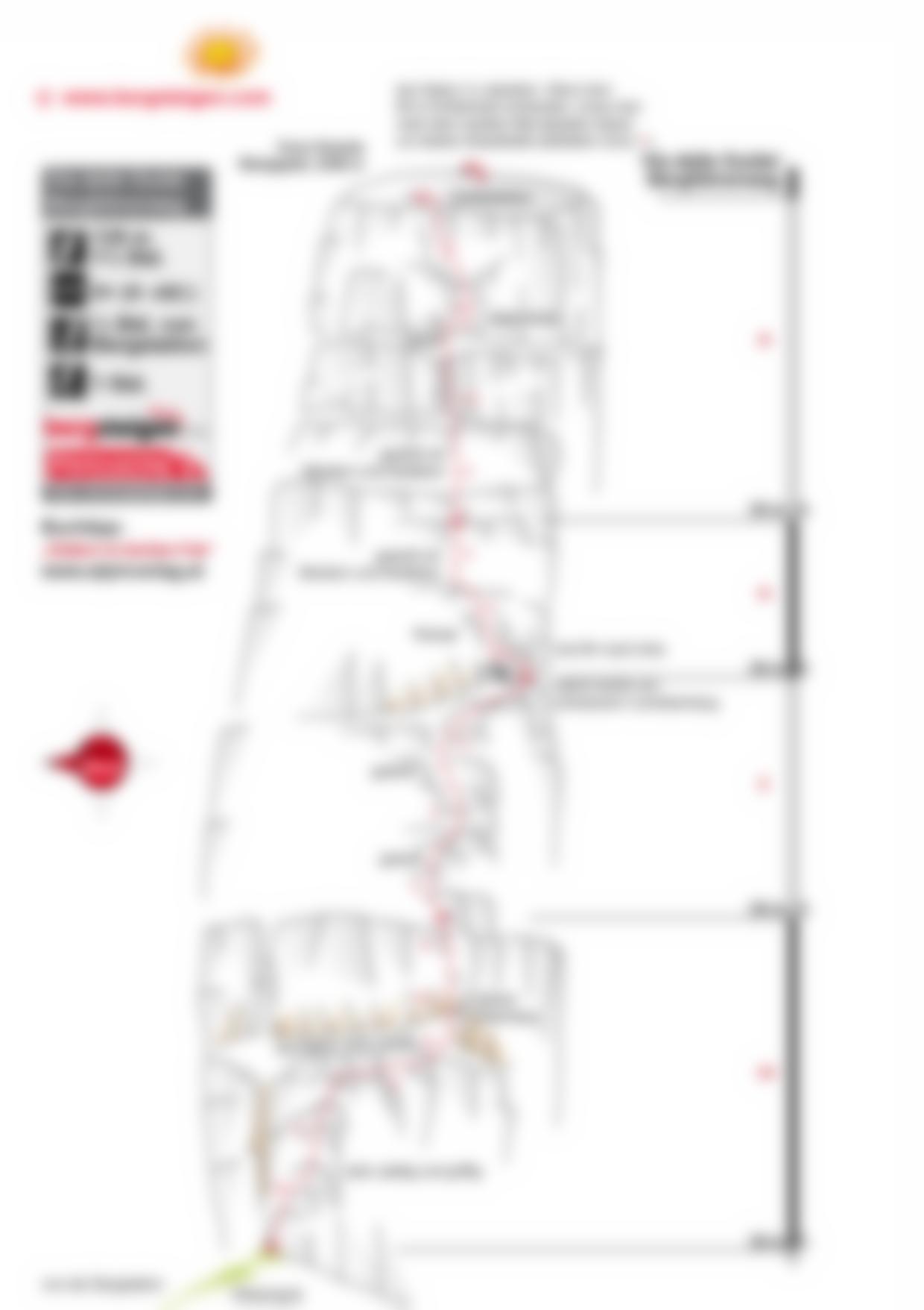 Auf dem Gipfelplateau ein paar Schritte nach Nordost zu einem einzementierten Haken. Von dort seilt man am besten 3 Mal ab (wenn man kein 60 m Einfachseil hat, muss man zur letzten Abseilstelle minimal und leicht abklettern). Man kommt an der Nordseite des Turmes wieder auf festen Boden und geht zurück zum Einstieg.