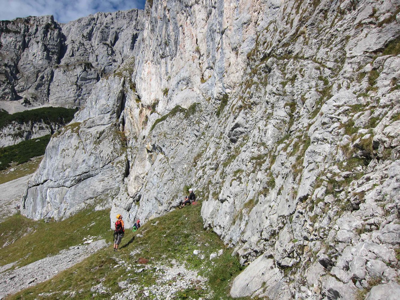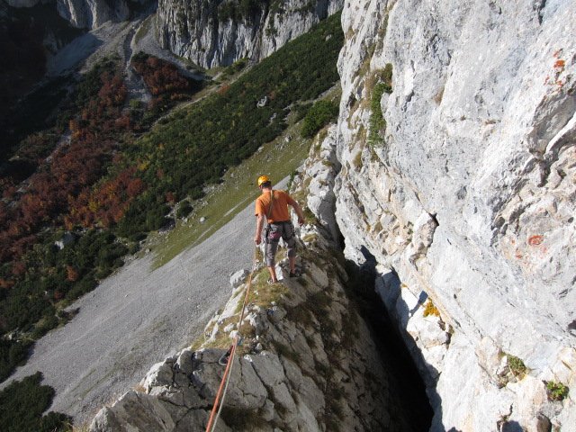 Vom Ende der Tour über die Route abseilen. Man seilt teilweise recht luftige 3 x 50 Meter und 1 x 20 Meter ab (siehe Übersichtsbild). Dann auf dem schon bekannten Zustiegsweg zurück zum Parkplatz beim Jägerwirt.