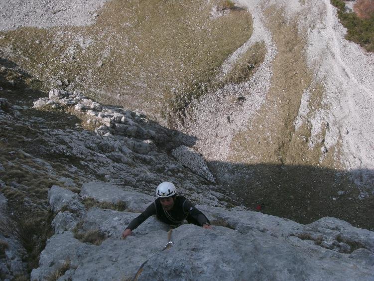 Die Tour ist recht gut abgesichert - fast schon super plaisirmäßig mit Bohrhaken bestückt. Mit Helm klettern, auch Gämsen können Steinschlag auslösen. Vorsicht, bei Schneelage im Frühjahr - die Platten liegen in einer gefährlichen Lawinenzone (Nassschneelawinengefahr!). Tipp: Die Multerkarwand ist auch im Hochsommer ein gutes Tourenziel - da die Wand bis zum Nachmittag im Schatten liegt.