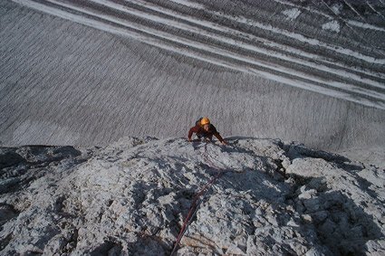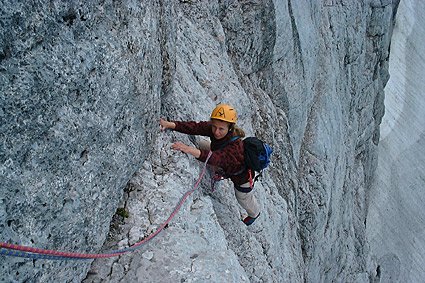 Wenn nach einem weitere Seillschaften in die Wand einsteigen, ist im oberen Wandteil extrem auf das Vermeiden von Steinschlag zu achten!!!