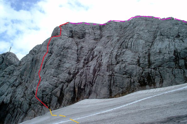 Gut abgesicherte Genusskletterrei am Nordpfeiler des Kl. Koppenkarsteins. Die Tour führt über sehr steile Platten und endet auf Bändern mit viel losem Gestein. Der Fels ist durchwegs gut, nur liegen im oberen Wandteil sehr viele lose Steine. Aufgrund der nordseitigen Lage etwas für heisse Tage