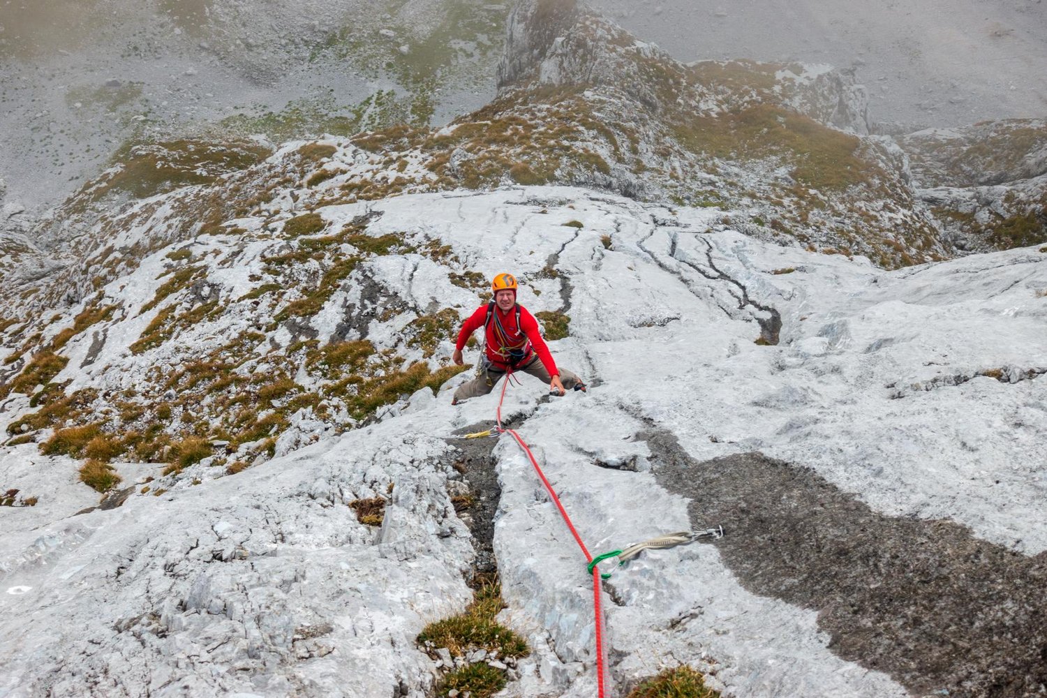 Neue Plaisirroute an der Hochschwab Südwand. Die Route kann hinsichtlich Felsqualität nicht mit den Routen im rechten Wandteil mithalten. Sie ist dafür aber perfekt mit vielen Bohrhaken gesichert. Die Kletterei ist etwas inhomogen und bietet in Wandmitte auch eine schöne Wiesenlänge. Die Stände sind zum Abseilen eingerichtet.
