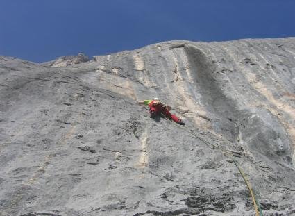 3 SL 48 m bis VII+/VIII-, gewaltige leicht geneigte Wandkletterei vom "Allerfeinsten".. Dafür etwas längere Hakensabstände....