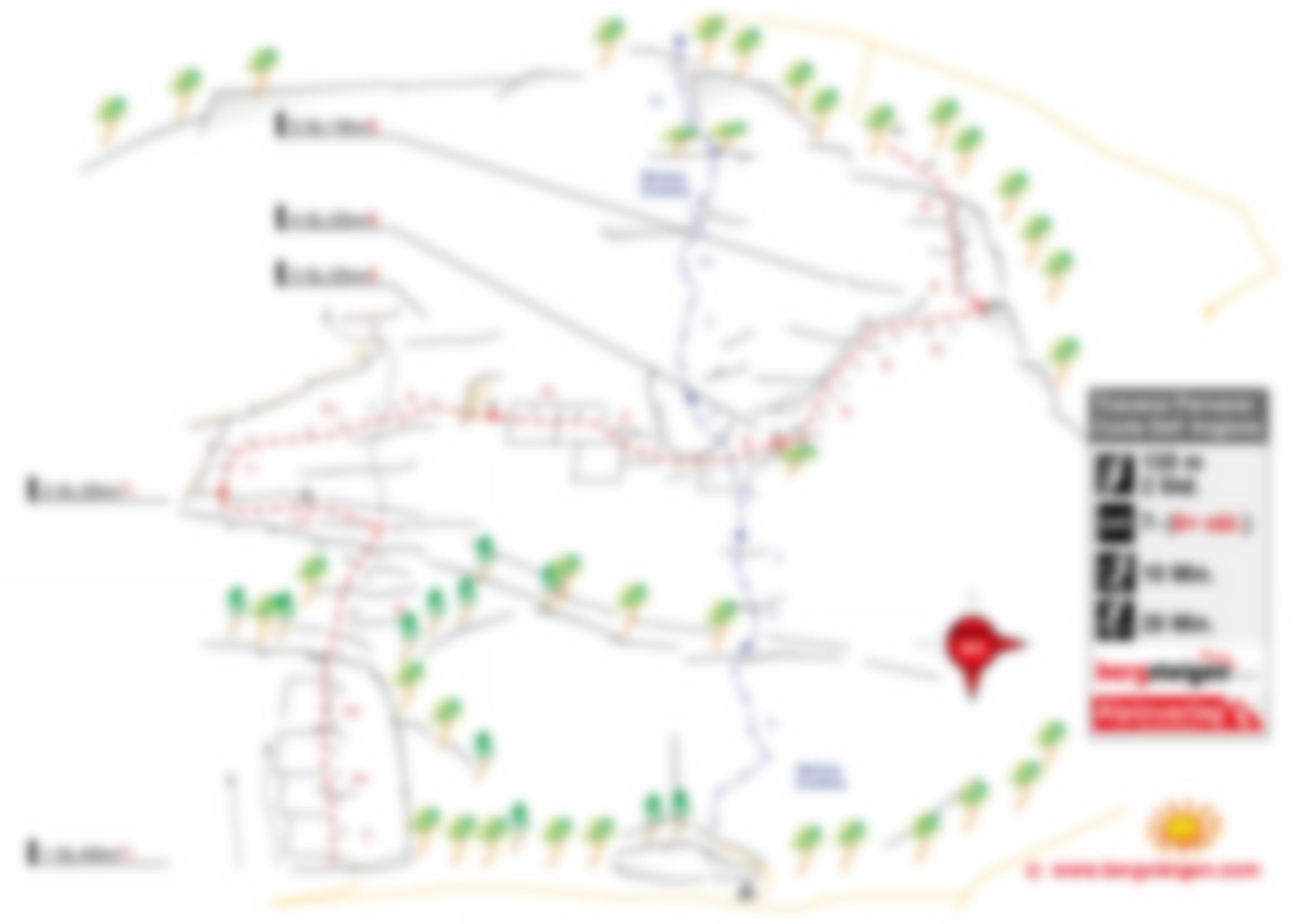 Vom Parkplatz auf der Straße Richtung Bauernhof „Maso Lizzone“ und davor links abzweigen (Wegweiser Wanderweg Nr. 428 „Sentiero degli Scaloni). Dem markierten Weg bis unter die Wand folgen und auf gutem Pfad am Wandfuss nach links zum Klettergarten abzweigen. Der Einstieg ist bei rechtester Tour (rote Schrift).