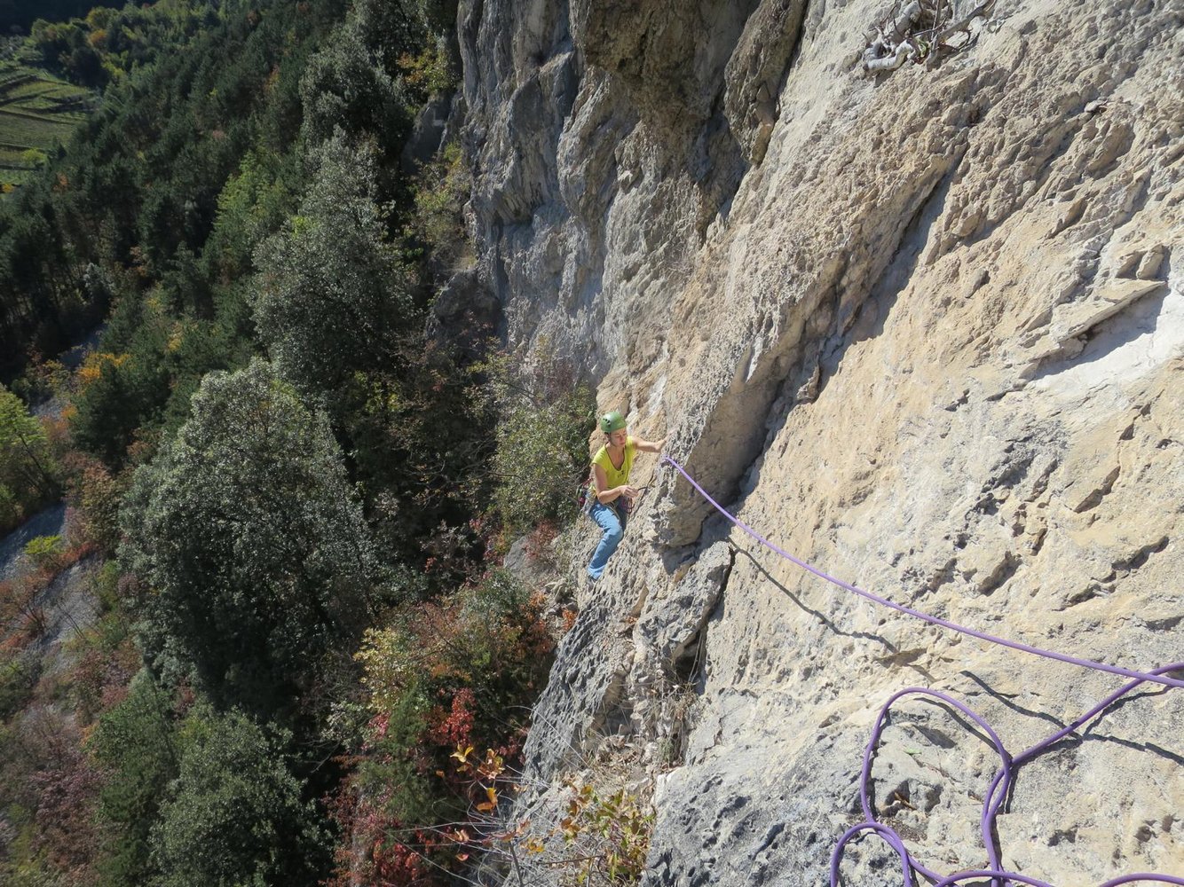 Kurze aber dafür sehr abwechslungsreiche, schöne und fotogene Route an Tropflöchern über den malerischen Weingärten von Dro. Die Route Traversi Perversi beginnt am rechten Rand des Klettergartens La fattoria degli struzzi und quert dann leicht ansteigend durch die gesamte Wand.