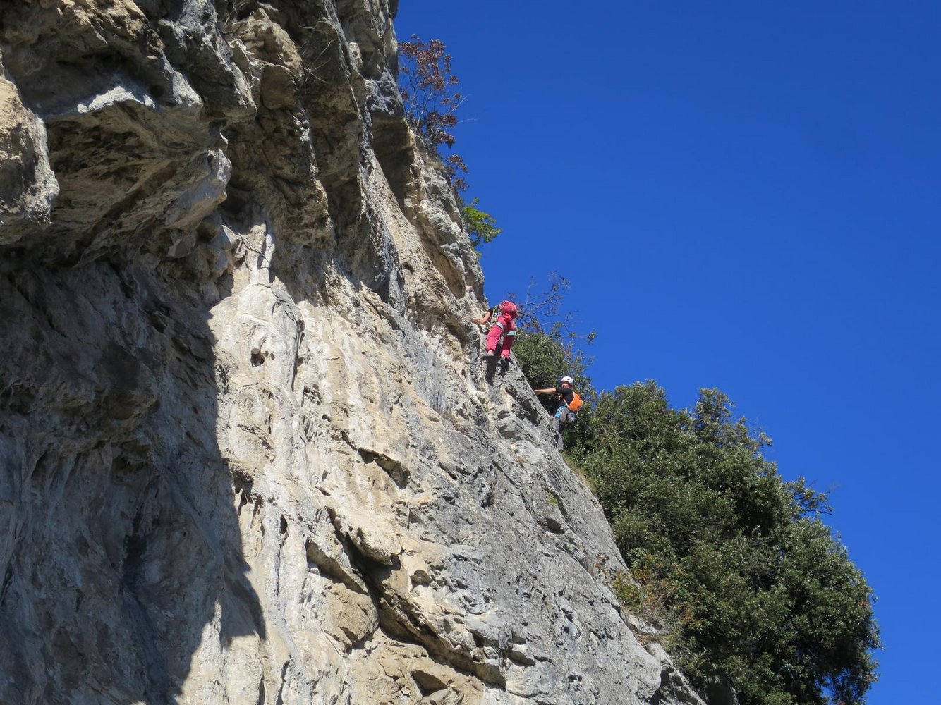 Vom Ausstieg kurz weiter aufsteigen (ungut erdig) bis man auf den markanten Wanderweg Nr. 428 „Sentiero degli Scaloni" trifft. Auf diesem orographisch links zum Wandfuß absteigen und über Zustieg zurück.