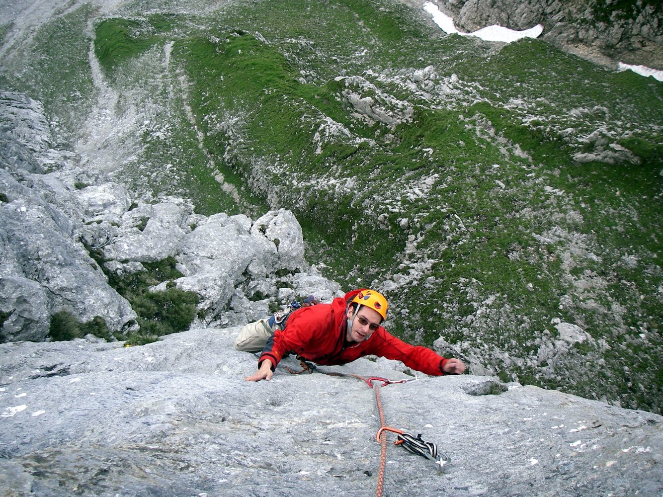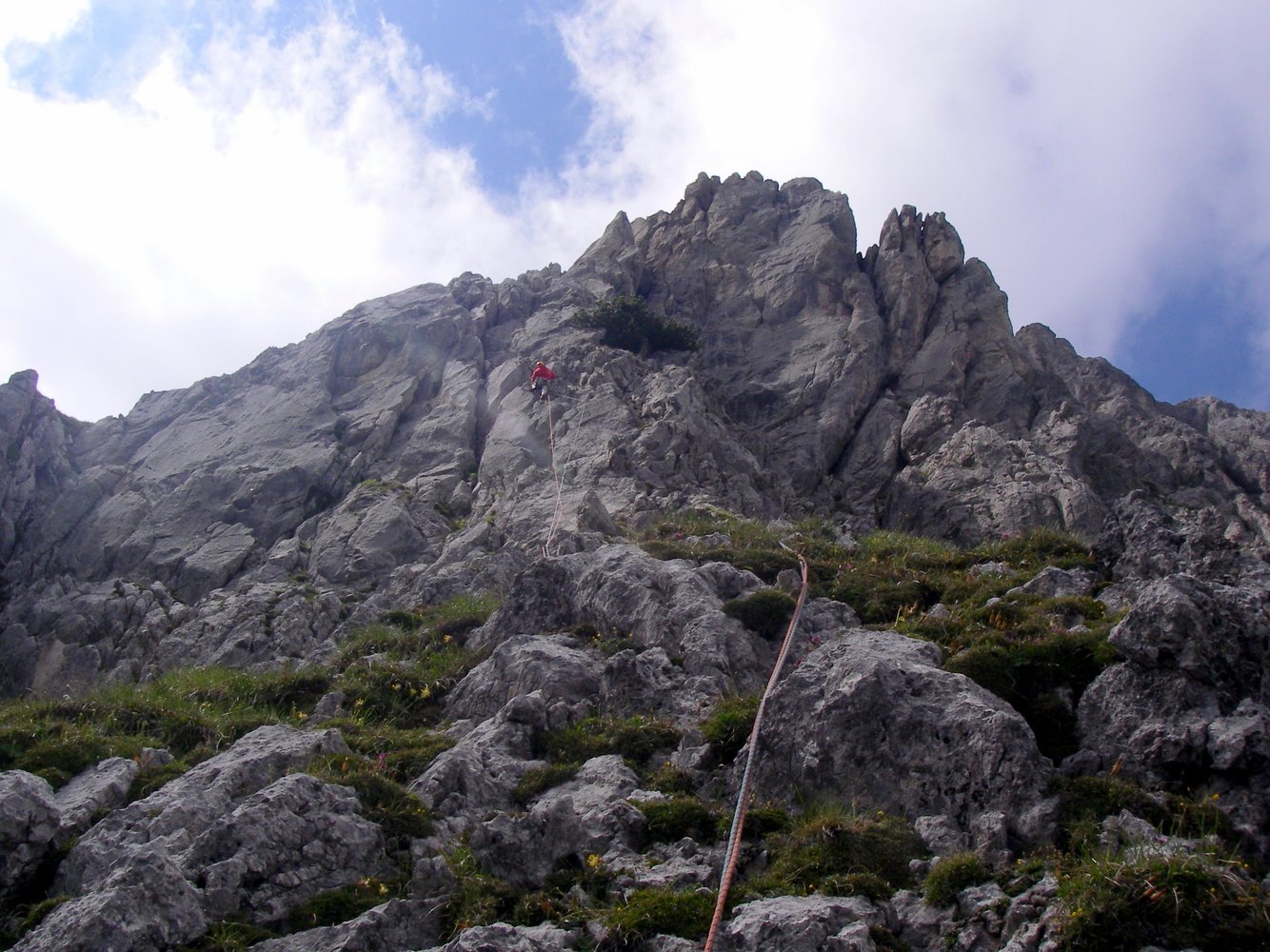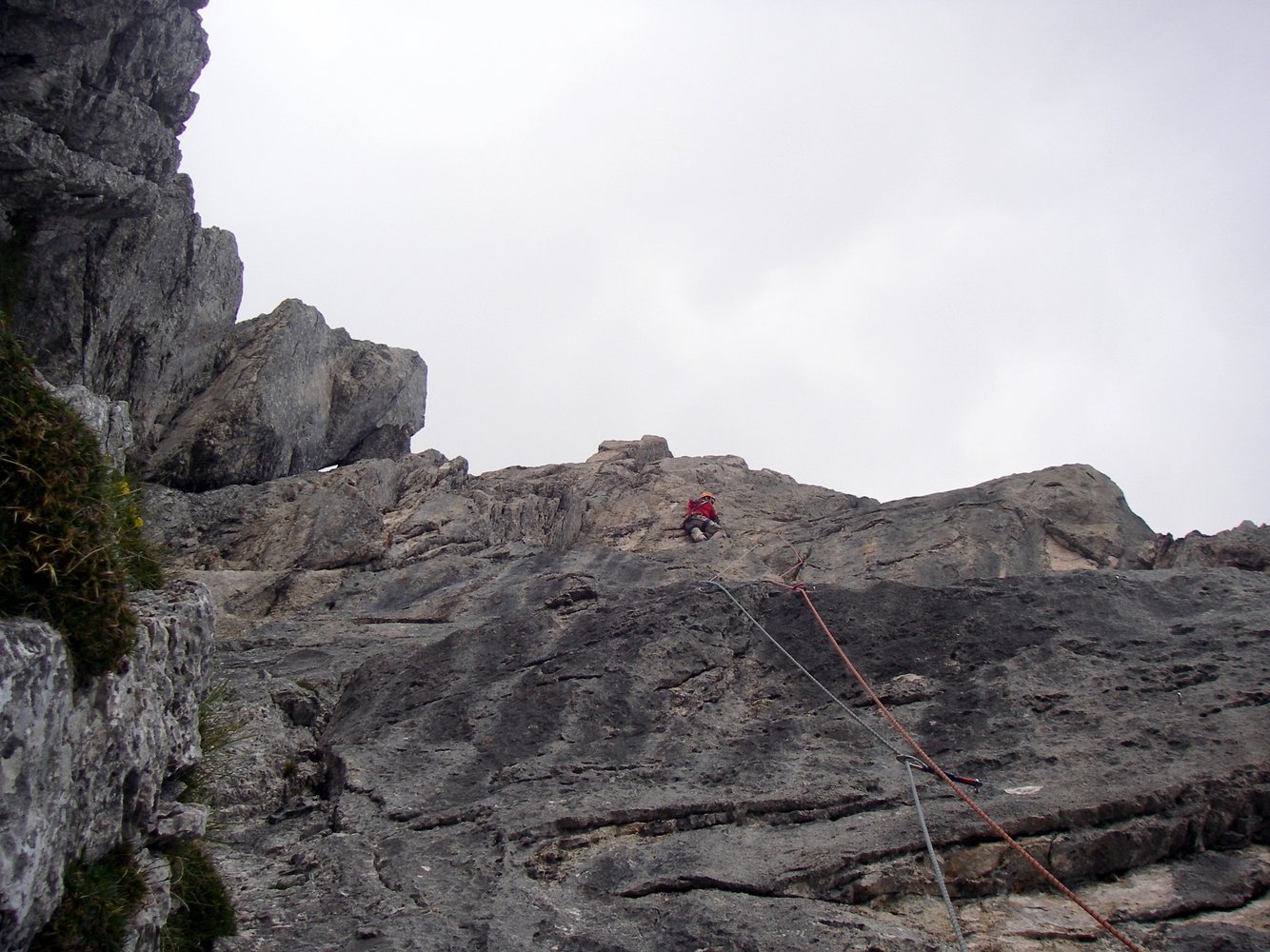 2. Abseilen: Beim zweiten Abseilen nicht entlang der Route, sondern 50 m gerade hinunter über steiles Gras zu Köpfl (siehe Skizze), von hier 10 m zurück zu Stand. Jetzt 10 m Abseilen zu weiterem Stand (weil dann das Seil besser zum Abziehen geht) und von hier 50 m Abseilen zum Einstieg. Insgesamt 4 x Abseilen (45m/ 50 m/ 10m/ 50m). Empfehlung: vom Einstieg nochmals 25 m Abseilen.