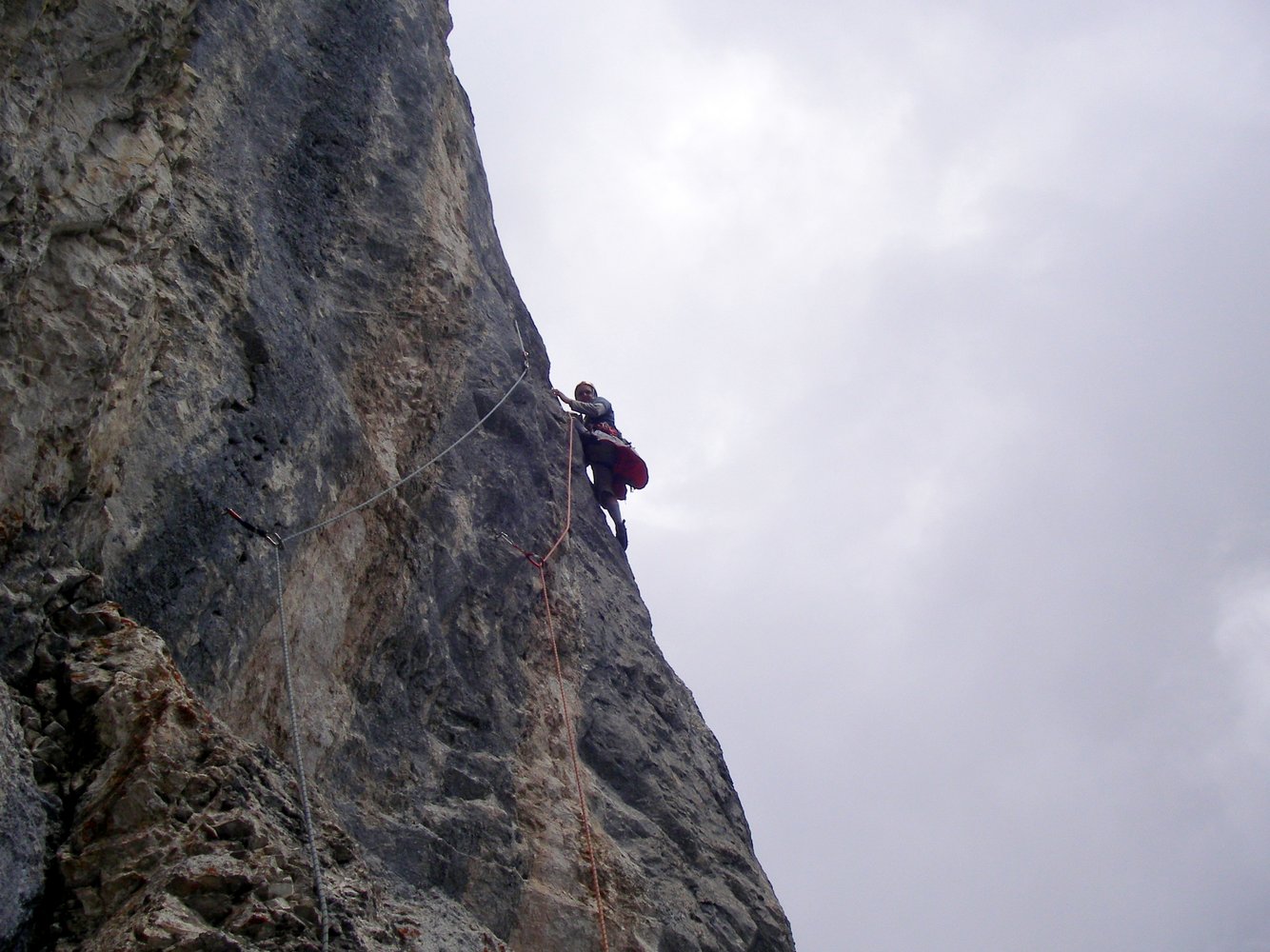 13 Expreß, 50 m Doppelseil, Helm ; die Tour ist komplett mit AustriaAlpin-Klebehaken klettergartenmäßig durchgesichert; immer den BH folgen