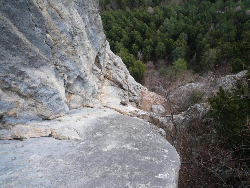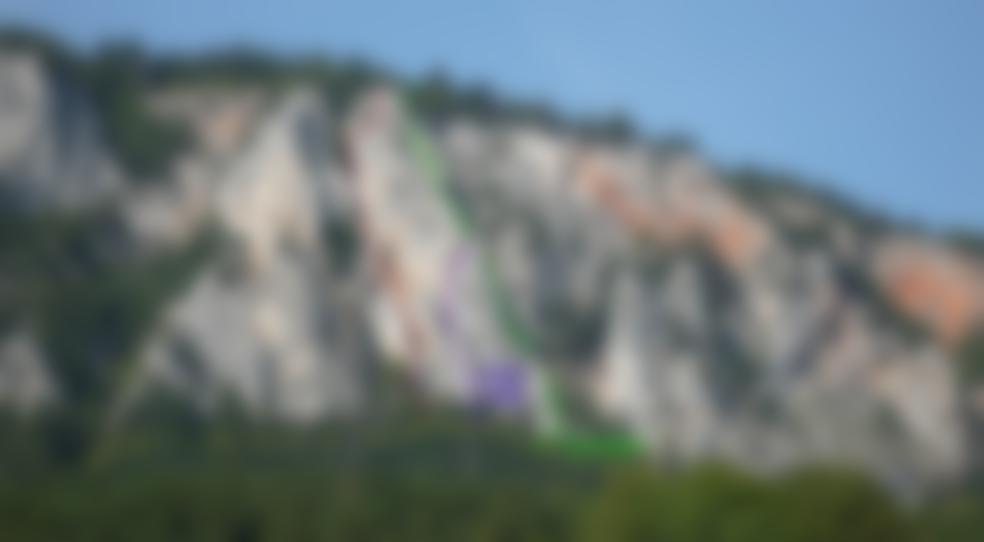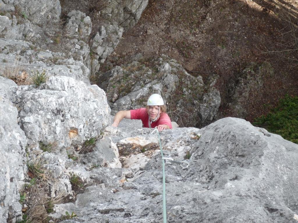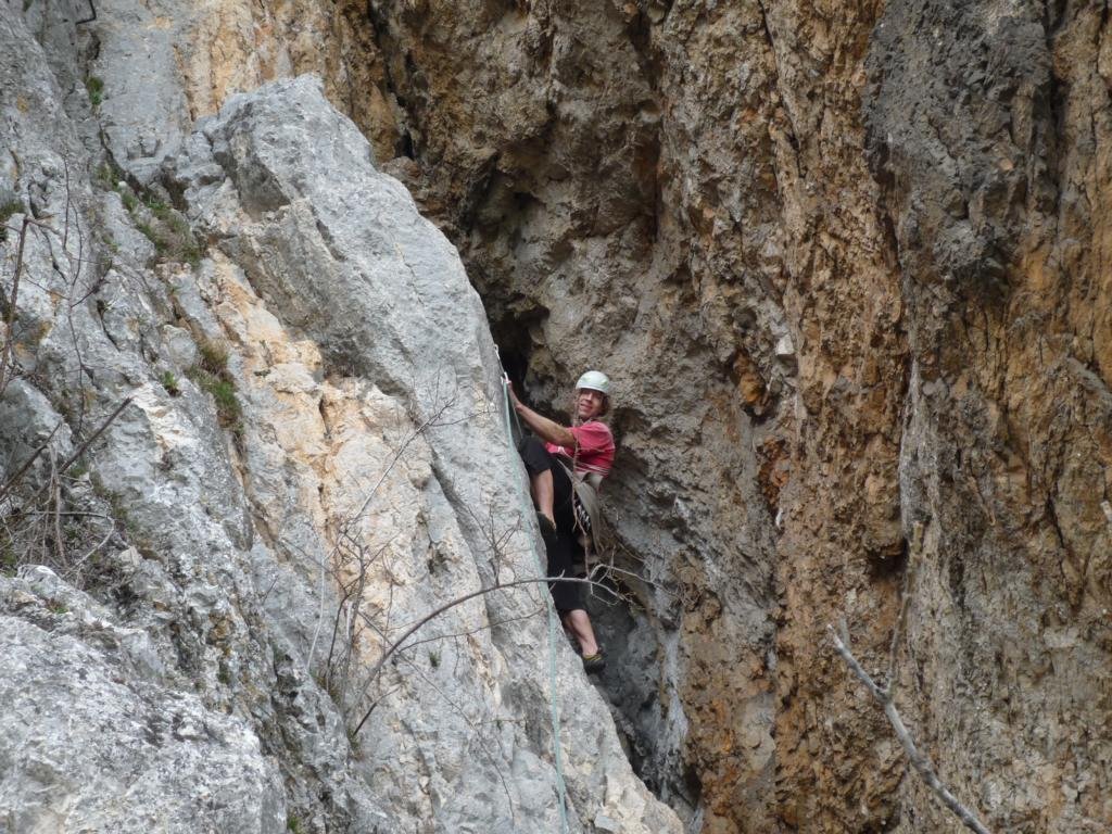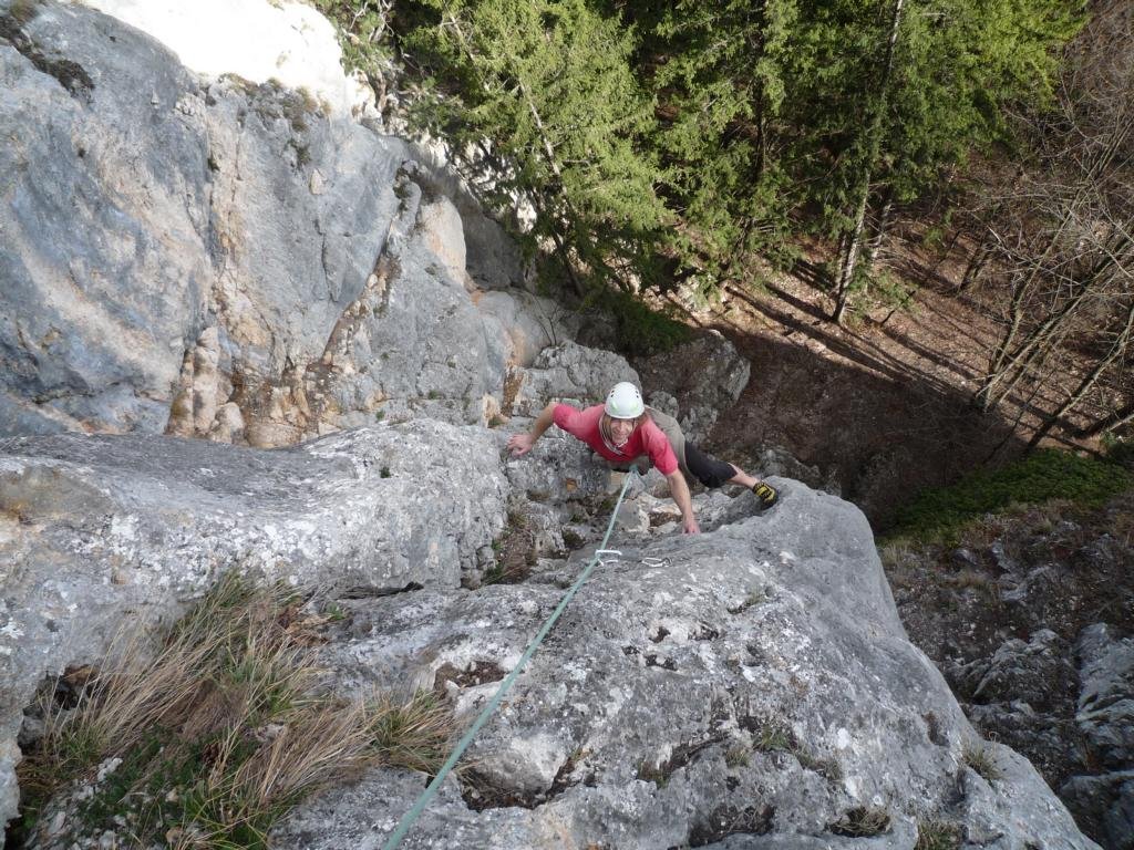 Neue Linie vorbei an der Tristangrotte, die Teile einiger bestehender Routen mitnimmt und abwechslungsreiche und auch nette Kletterstellen bietet, aber nicht ganz zu den Toptouren auf der Wand aufschließen kann.