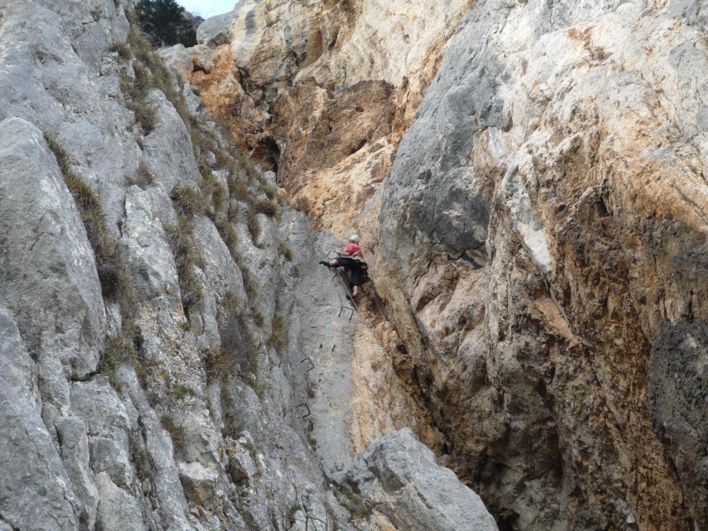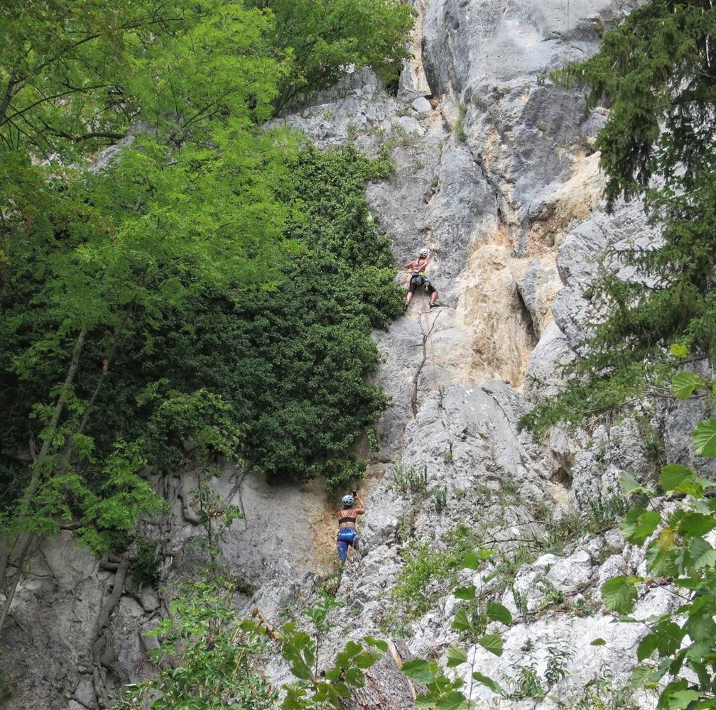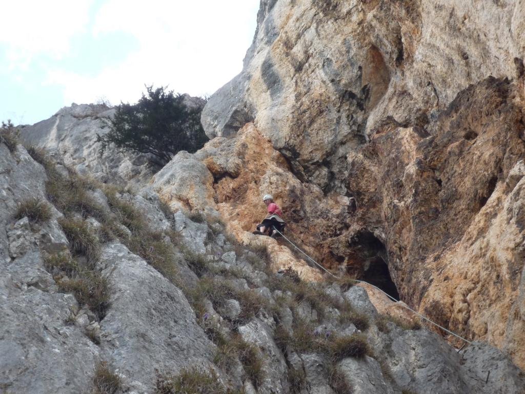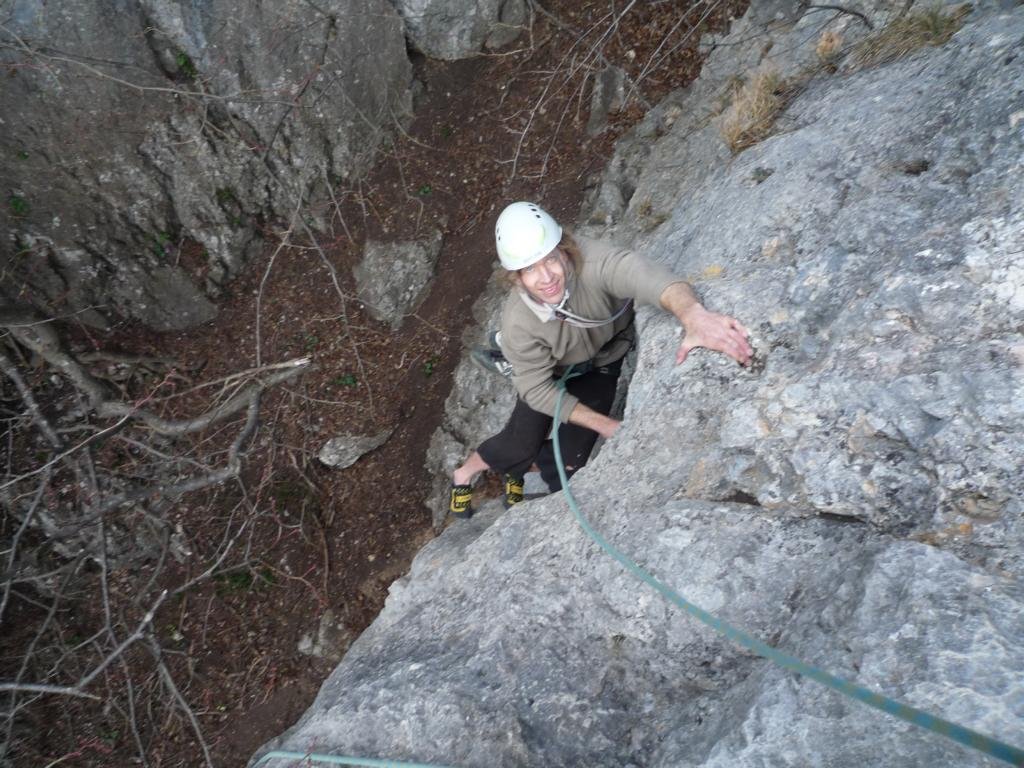 Neue Linie vorbei an der Tristangrotte, die Teile einiger bestehender Routen mitnimmt und abwechslungsreiche und auch nette Kletterstellen bietet, aber nicht ganz zu den Toptouren auf der Wand aufschließen kann.